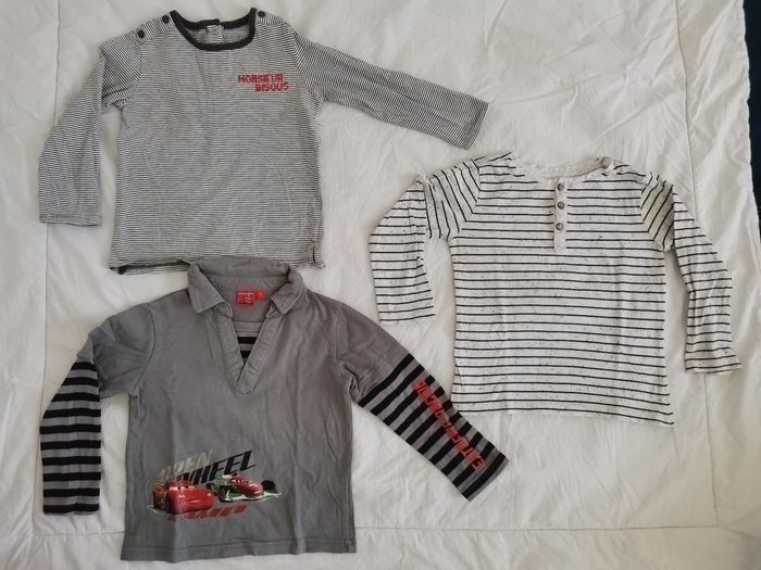 Lot de tee shirts manches longues taille 36 mois / 3 ans dont un Disney cars, un LH et un Kiabi. Très bon état, seule une petite tâche sur un tee shirt voir photo.
