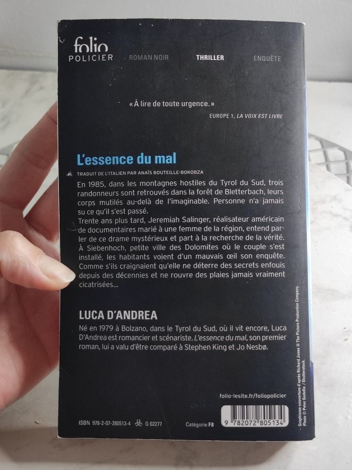 "En 85, dans les montagnes hostiles du Tyrol du sud, 3 randonneurs sint retrouvés dans la forêt, leurs corps mutilés. Personne n'a jamais su ce qu'il s'est passé. De luca d'andrea. Léger état d'usure sur la couverture intérieur intacte
