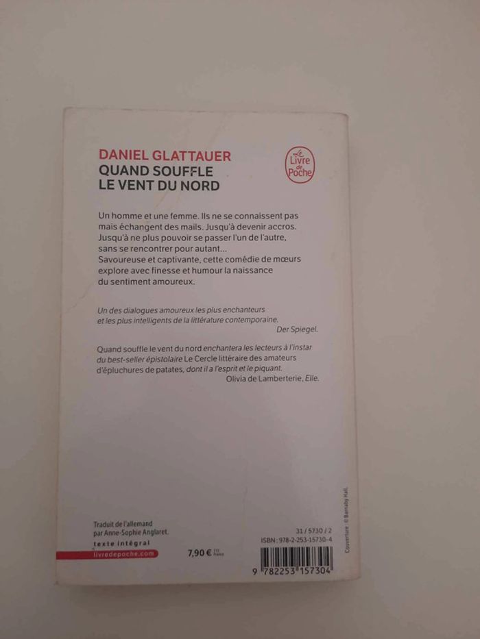 Quand souffle le vent du nord de Daniel Glattaeur Maison d’édition : Le livre de poche Résumé : Un homme et une femme. Ils ne se connaissent pas mais échangent des mails. Jusqu'à devenir accros. Jusqu'à ne plus pouvoir se passer l'un de l'autre, sans se rencontrer pour autant ... Savoureuse et captivante, cette comédie de moeurs explore avec finesse et humour la naissance du sentiment amoureux. Pages jaunies, coins cornés et traces de pliures sur le dos