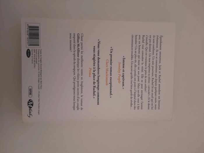 Jusqu’à ce que la vérité nous sépare de Gillian McAllister Maison d’édition : Bragelone, Milady Résumé : Éperdument amoureux, Jack et Rachel attendent un heureux événement. Ils ne se connaissent que depuis quelques mois, mais ils sont confiants. Un soir, pourtant, Rachel lit un mail qui ne lui est pas destiné. Un mot imprime sa rétine : “atrocité”. Et le doute s’installe. Qui est vraiment le père de son enfant ? Rachel veut connaître la vérité. Elle ne peut envisager l’avenir avec un homme qui ment sur son passé. Mais est-elle tout à fait honnête ? Un an plus tôt, elle a perdu son poste à l’hôpital dans des circonstances troubles. Un secret qu’elle s’est bien gardé de révéler … Pages jaunies, petits accros sur le côté de la tranche