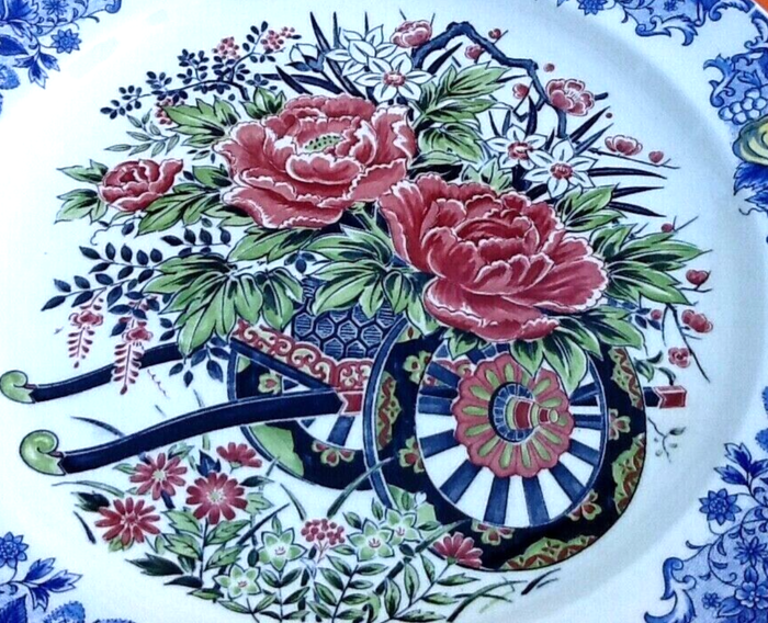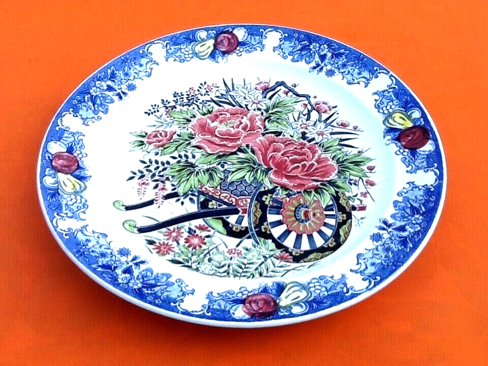 Grand plat creux Céramique polychrome Décor charrette de fleurs Diamètre : 415mm Hauteur : 55mm Poids : 1kg600