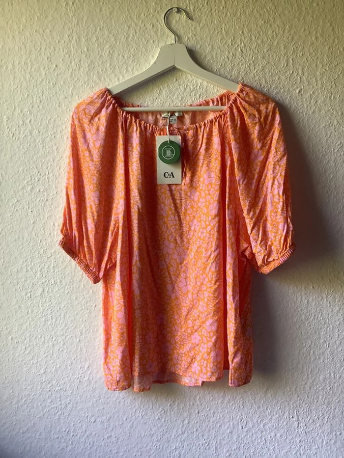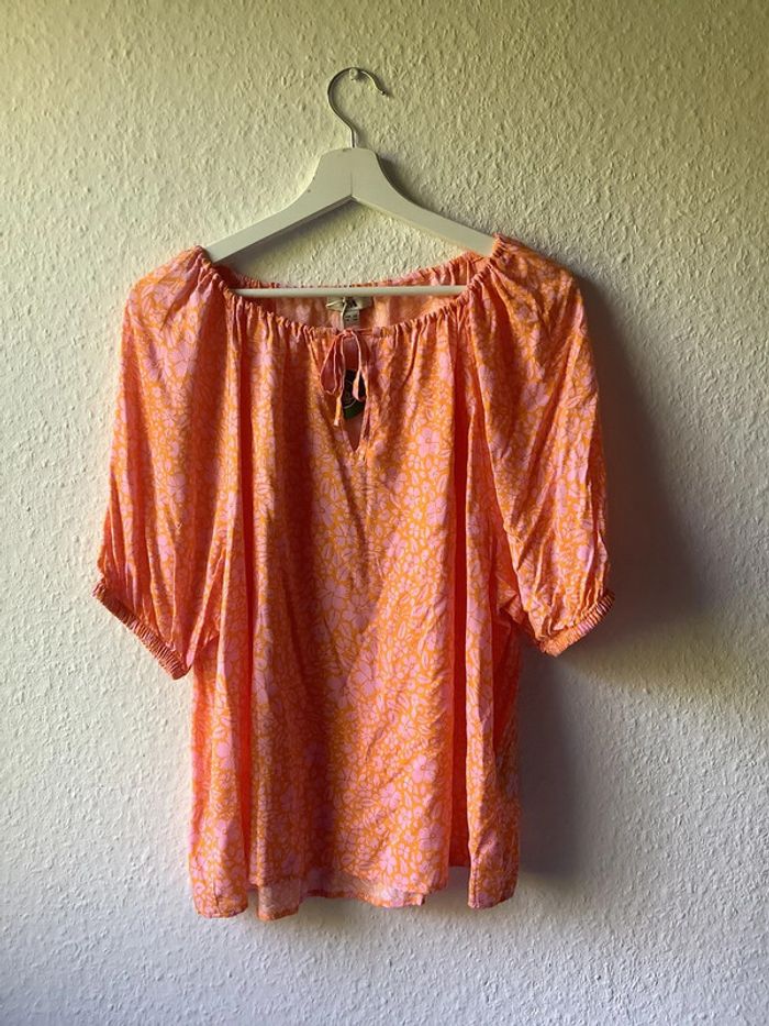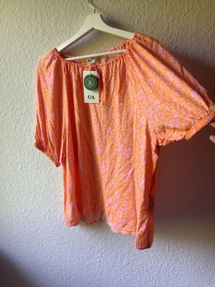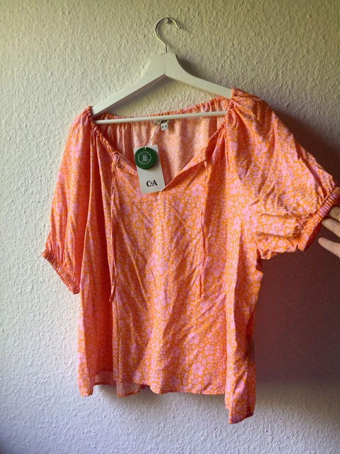 Blouse orange et rose a motifs neuf avec étiquette tres belles couleurs qui irait parfaitement avec un pantalon, une jupe ou un short blanc Ajustable au niveau du col (peut faire épaules dénudés) Taille EUR 40 / FR 42