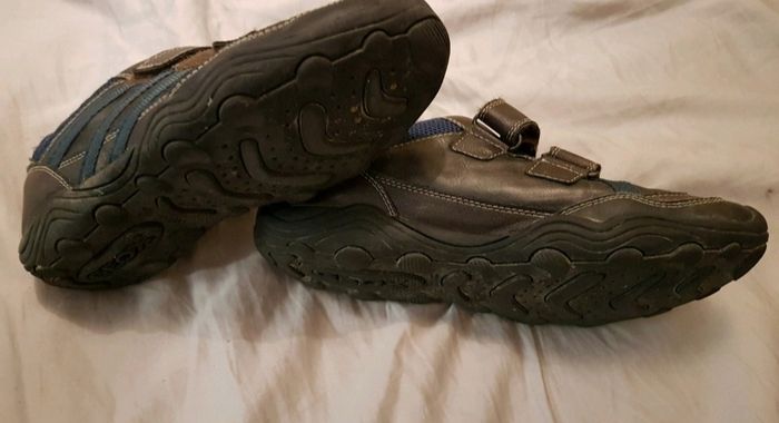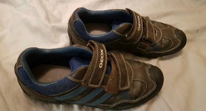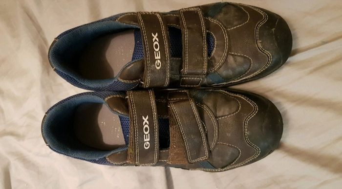 Chaussures Geox Taille 38 Peu porté. Bleu à l'intérieur un peu délavé. Plié du au stockage. Scratch pas très propre des trucs coincé dedans Cuir très légèrement délavé à un endroit.