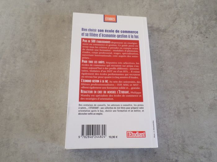 Petit livre de poche broché de 283 pages de l’auteur Philippe Mandry, spécialiste des écoles de commerce et des stratégies d’orientation Editions l’Etudiant Ce guide complet vous apporte les réponses à toutes vos questions, mais il vous donne surtout les clés pour faire les bons choix parmi des centaines d’écoles et des parcours plus ou moins faciles à décrypter Panorama complet des écoles de commerce et de leurs cursus, ce livre passe en revue tous les critères à prendre en compte avant de choisir sa formation : modalités d’admission, études, spécialisation, corps professoral, spécificités de formation, importance des stages, valeur des diplômes, opportunités internationales, côte auprès des entreprises… Très bon état Aucune page n’est manquante, endommagée, pliée, ni déchirée Aucun texte n’est souligné, ni surligné Cet ouvrage indispensable vous aidera à faire le bon choix ! 👉 Appliquer une réduction de -25% sur tous les livres 👉 N’hésitez pas à faire un lot pour profiter des réductions #karine78_livres