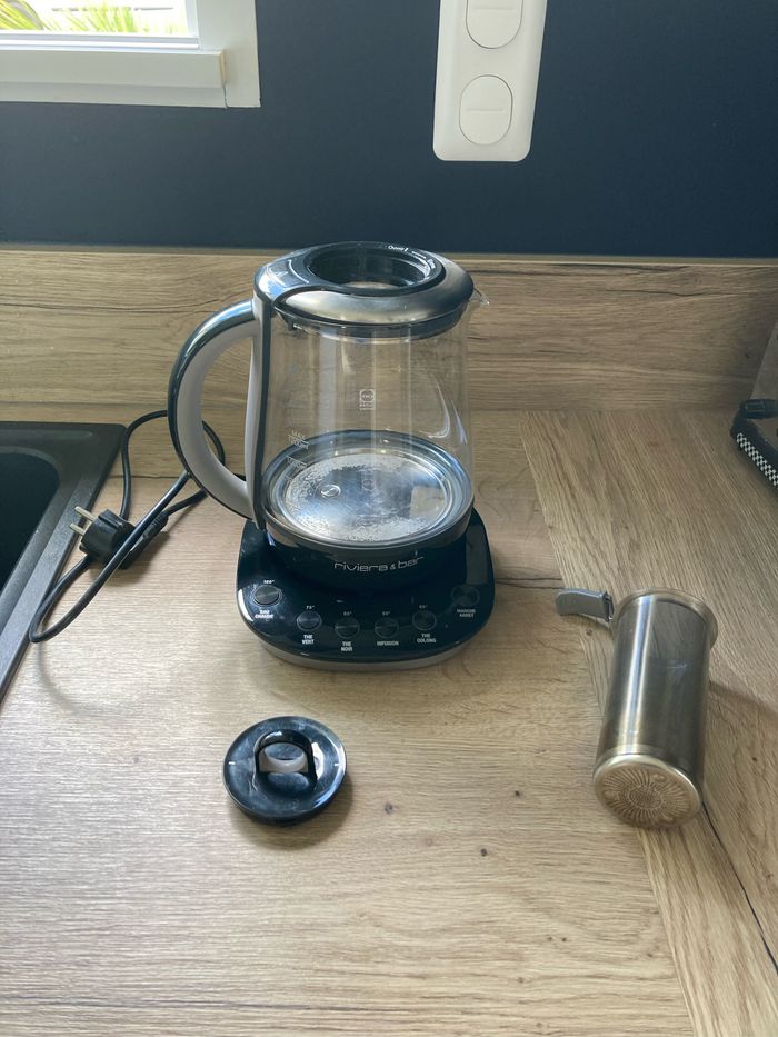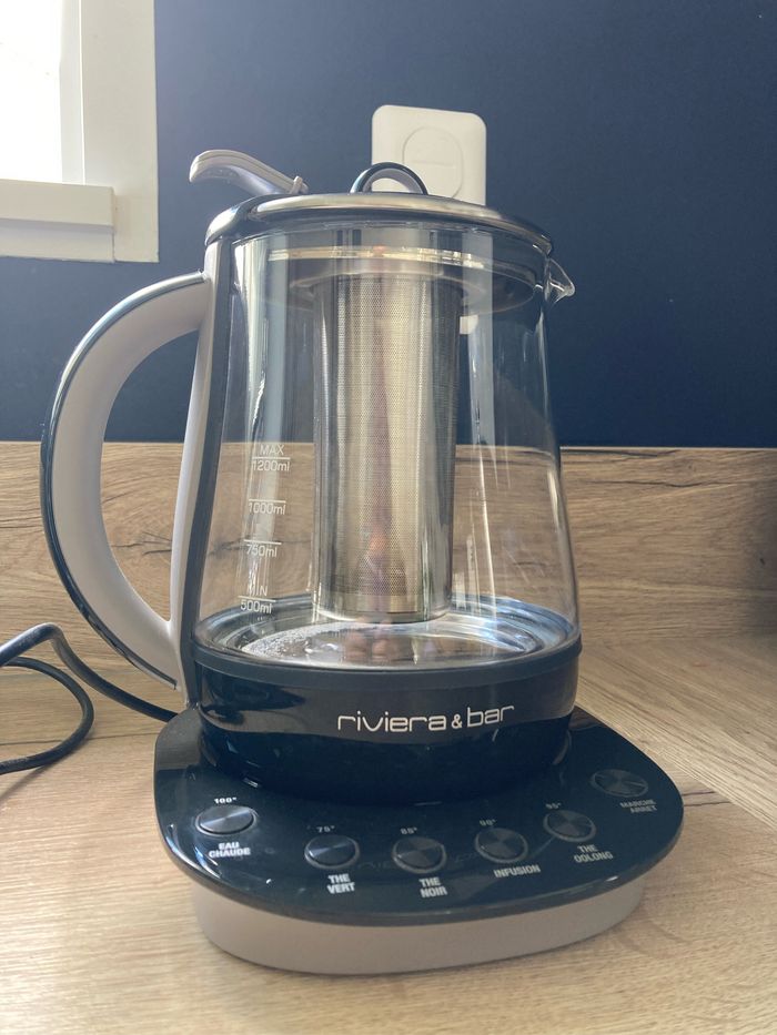 Vends bouilloire électrique de marque Riviera & Bar. Chauffe l’eau à la température souhaitée en fonction du thé choisi. Infuse le thé le temps nécessaire. Vous prévient par une sonnerie dès que votre thé est prêt. Très pratique Grande capacité.