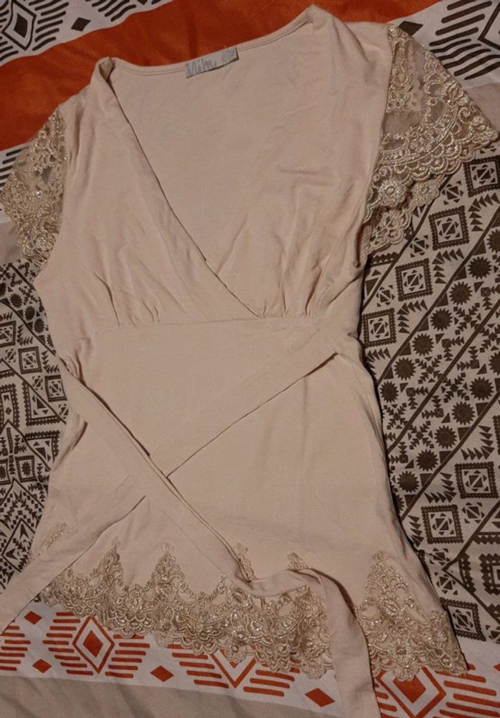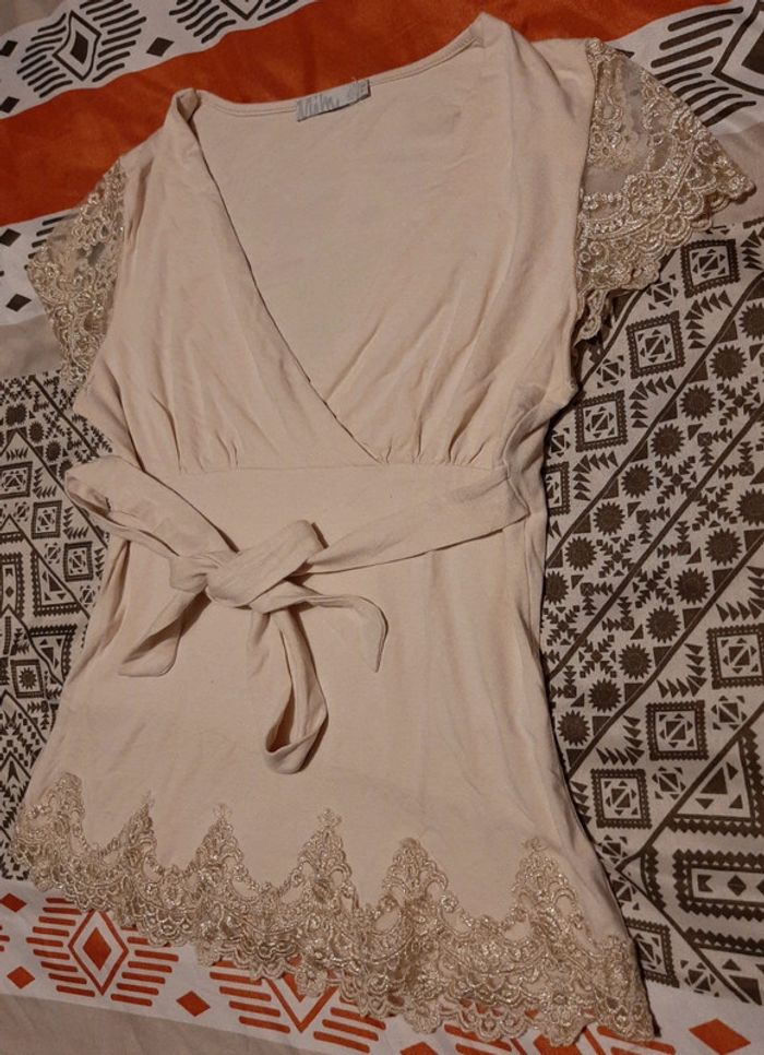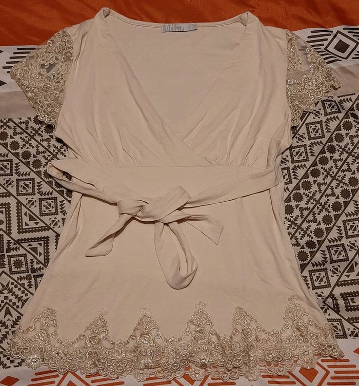 Magnifique t-shirt avec détails en dentelles. Couleur blanc cassé, crème. En très bon état. Avec une ceinture intégré à nouer au niveau de la taille. Noté taille 2 mais correspond plutôt à un S. N'hésitez pas à aller faire un tour dans mon dressing de nombreux autres vêtements à vendre à des tout petits prix et prix dégressif sur les lots 🌸je reste disponible pour toutes questions 🙂
