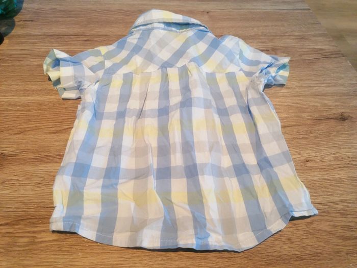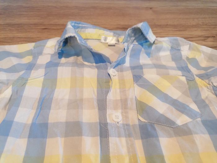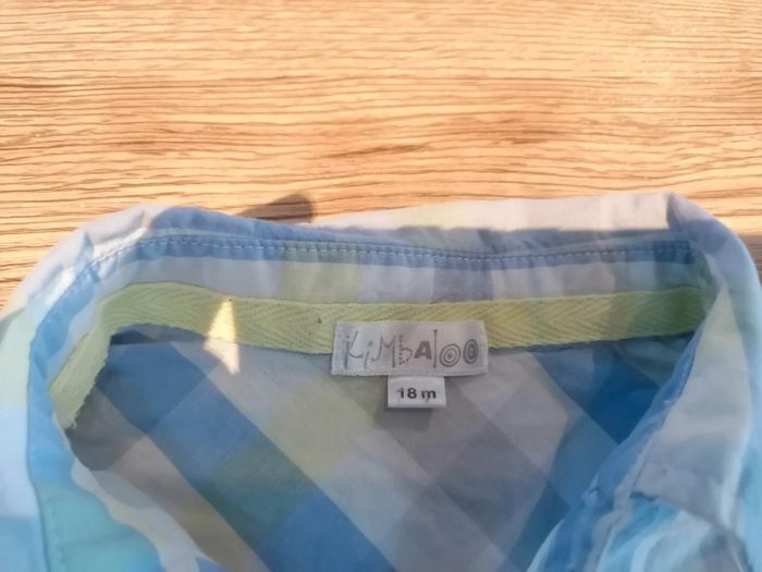 Bonjour, je vends cette chemise à manches courtes bleue blanche et jaune de la marque Kimbaloo taille 18mois en très bon état. Lavé maison non fumeur.
