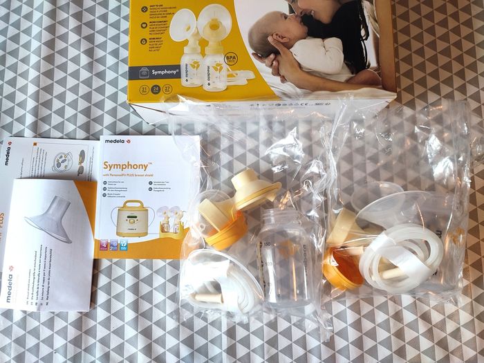Vends set double pompe Medela, convient avec le tire lait Symphony Diamètre des téterelles : 24 mm Jamais utilisé, un des sachets a été ouvert pour une démonstration du montage du set, par la pharmacienne (photo n°4)