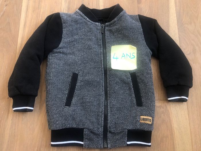 Veste rembourrée grise et noire avec fermeture éclair Marque : Liberto Taille : 4 ans Bien chaude, protège super bien du froid. Rembourrée de partout pour garder au chaud. 2 poches sur l'avant. Bouloches. Je vends plusieurs vêtements et jouets pour enfants, vous pouvez faire des lots en regardant mon dressing ;) Si vous avez des questions, n'hésitez pas..