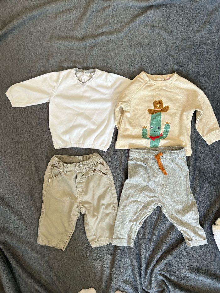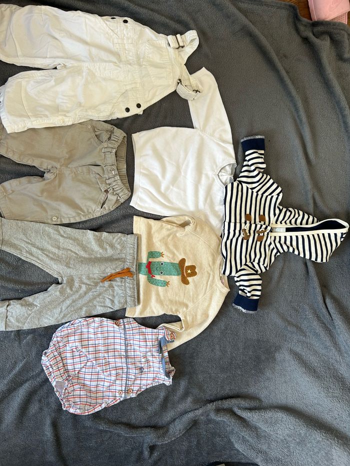 Très joli lot de vêtements garçon en taille 6 mois. Une salopette blanche H&M Une combi idéale pour l’été Sergent Major Un gilet marinière Obaibi Un bas jogging léger In extenson Un pantalon Obaibi Un pull beige Pomette Et un pull blanc Kitchoun