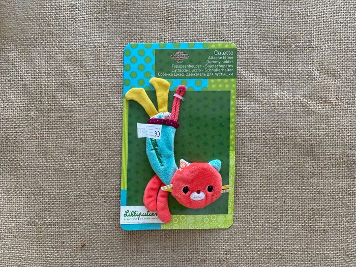 Un chat nommé Colette qui va distraire bébé et lui permettre de ne plus perdre sa tétine. Ses couleurs vives sont idéales pour l’éveil de bébé. lilliputiens 53