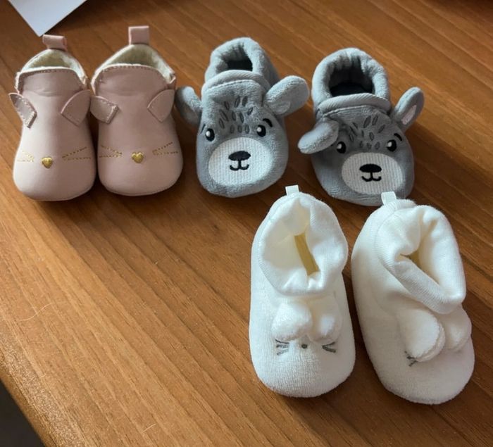 Lots de 3 paire 2 paire de chausson et 1 paire de chaussures Très peut servie Idéal pour la naissance Très bon état