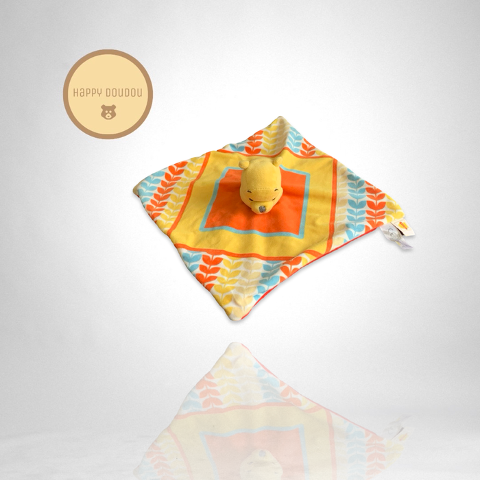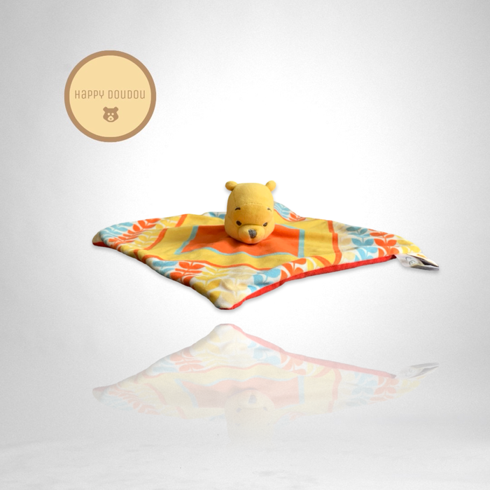 🧸 Doudou plat Winnie l'ourson orange bleu et jaune avec feuilles. Arriere rouge
