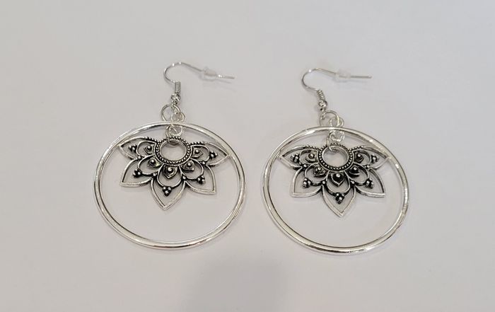 BOUCLES D'OREILLES ANNEAUX CREOLES LOTUS ARGENTE ! NEUF! 1 jolie paire de boucles d'oreilles motif anneaux creoles lotus argenté. Hauteur totale : 6 cms . Diametre du cercle :3,5 cms. N'hésitez pas à regarder mes autres ventes. Envoi rapide et soigné.