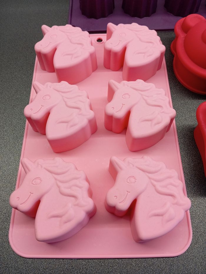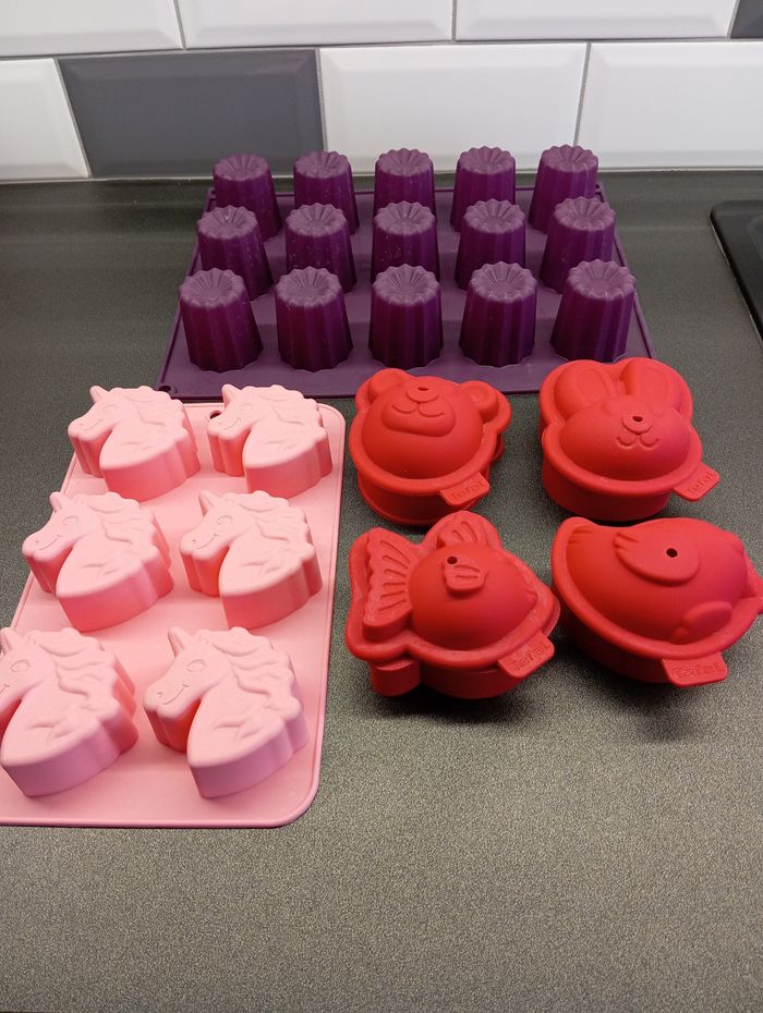 Lot de moules à pâtisserie en silicone un grand pour cannelés un avec forme licorne et des petits en forme d'animaux