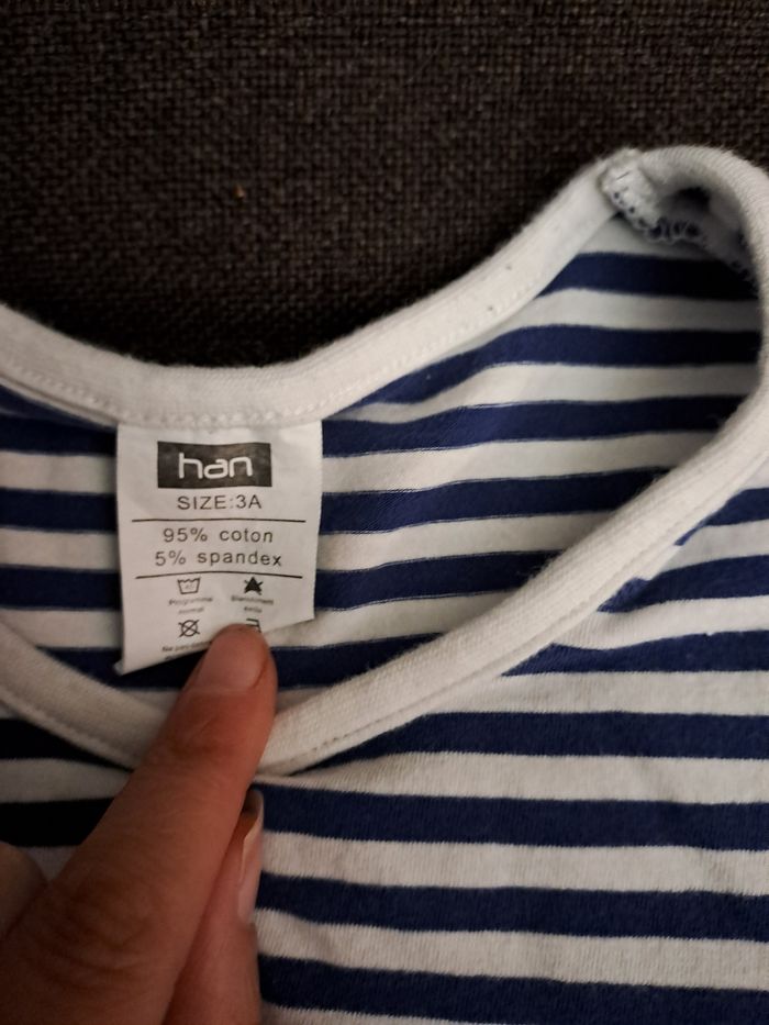 Tee-shirt manches courtes en 3 ans. Il y a des pressions à l'arrière. Non repassé.
