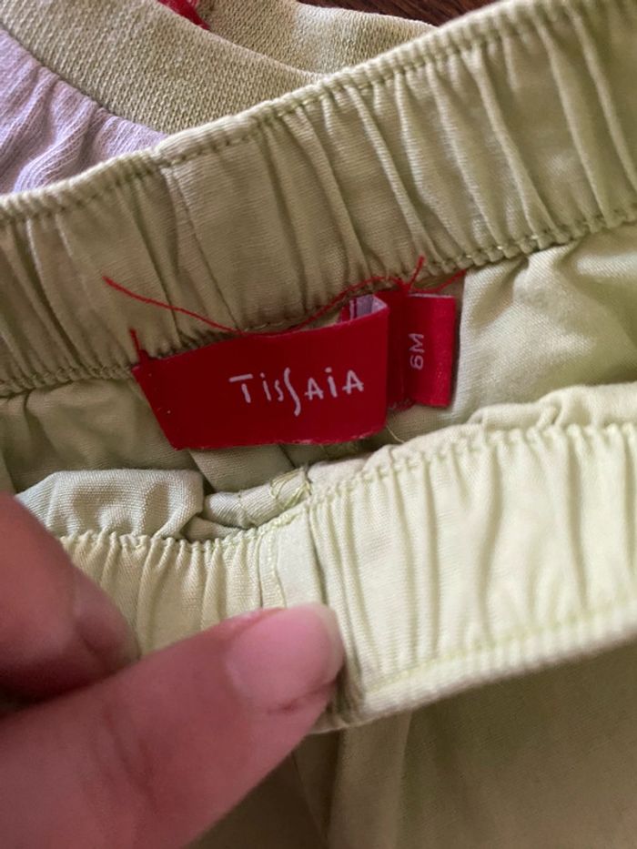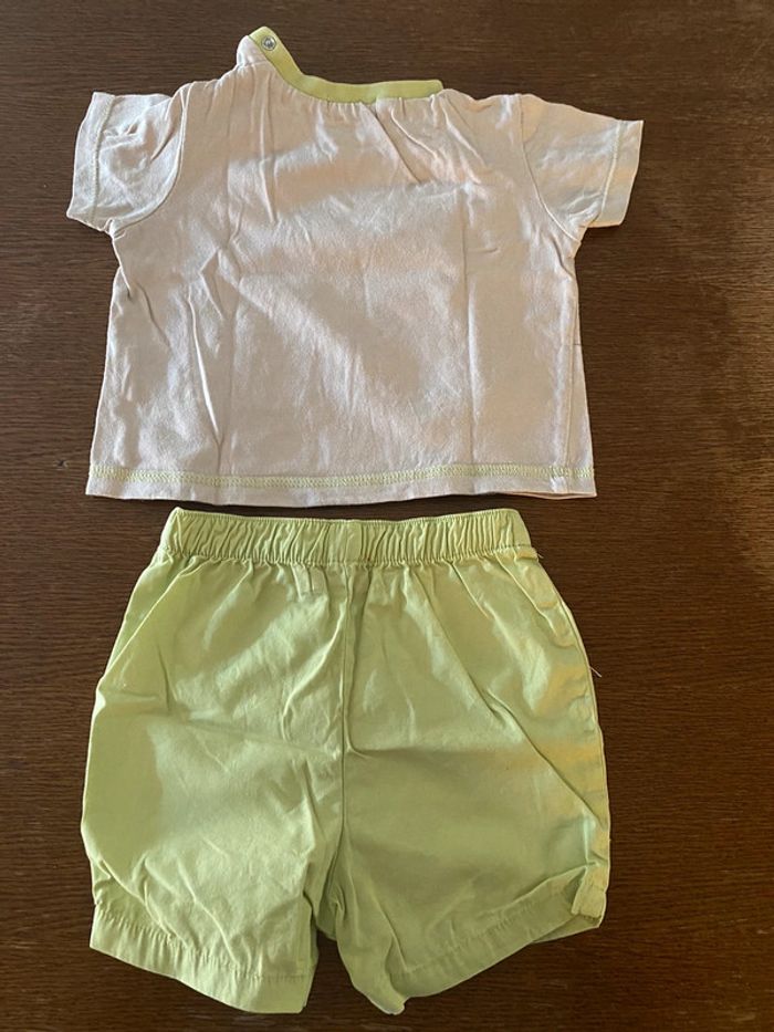 Ensemble t-shirt manche courte beige "safari road" + short vert clair 6 mois marque tissaia en très bon état #vetement6moisVero66xx