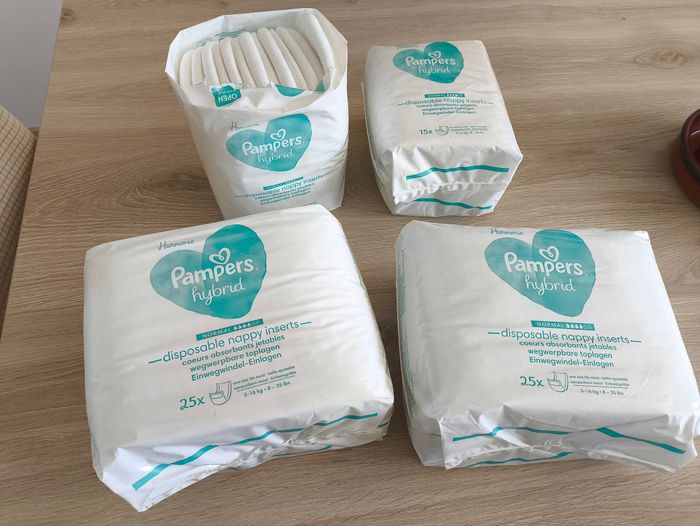 Vend paquets inserts jetables Pampers 1 paquet d'ouvert pour tester et finalement on ne partira pas sur des couches lavables. Donc 13 inserts sur 15 dans ce paquet, les autres sont neufs. 1 de 15 et 2 de 25. Couche lavable Pampers non utilisée