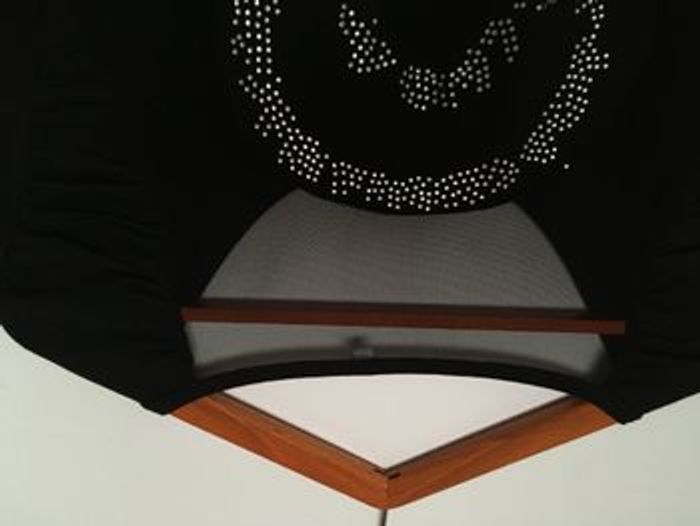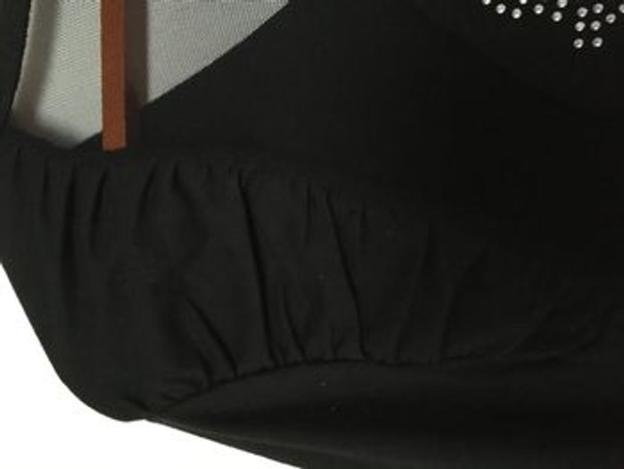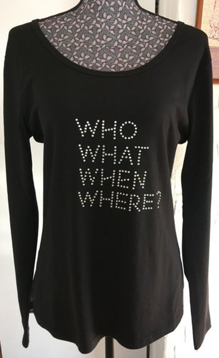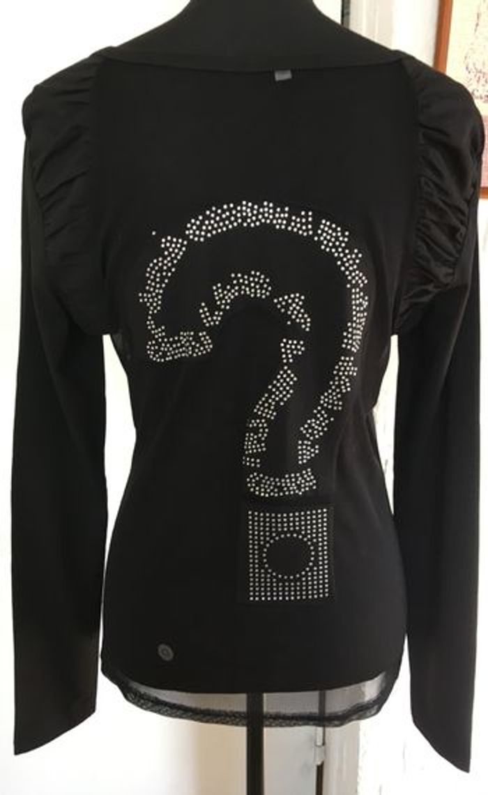 Teeshirt noir manches longues, impression en strass devant, effet de fronces dans le dos au niveau des manches (photo 3), dos complètement transparent avec motif point d'interrogation en strass, 60% polyester, 35% coton, 5% élasthanne, Taille 38/40 Les réductions à partir de 2 articles sont activées