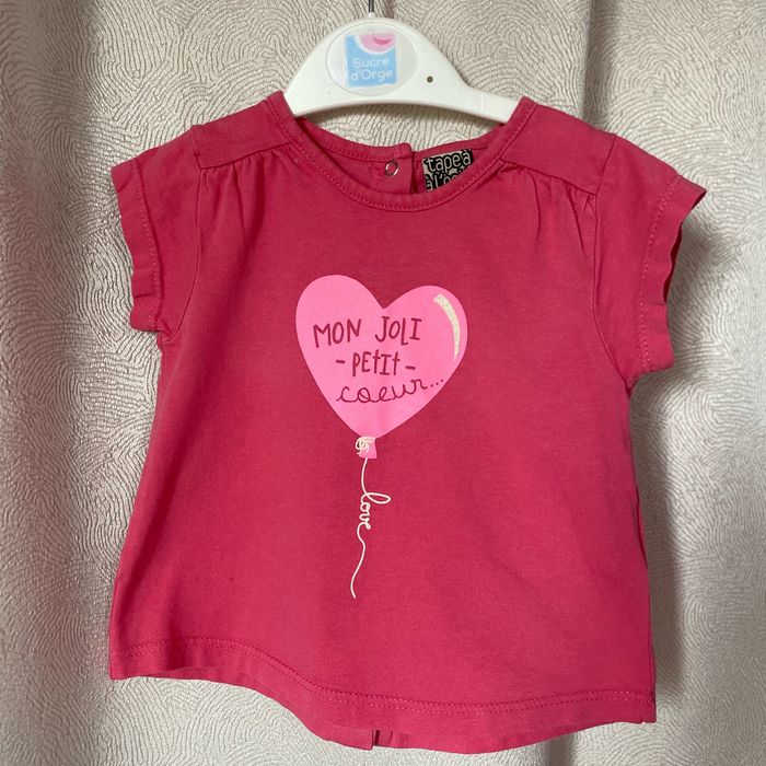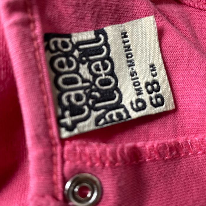T-shirt manches courtes rose coeur pailletée devant S’ouvre entièrement au dos par pressions 100% coton et pantalon jeans denim style saroual Revers en bas Que des fausses poches Réglable à la ceinture 65% coton 35% polyester Les 2 en taille 6 mois 68 cm Tape à l’œil