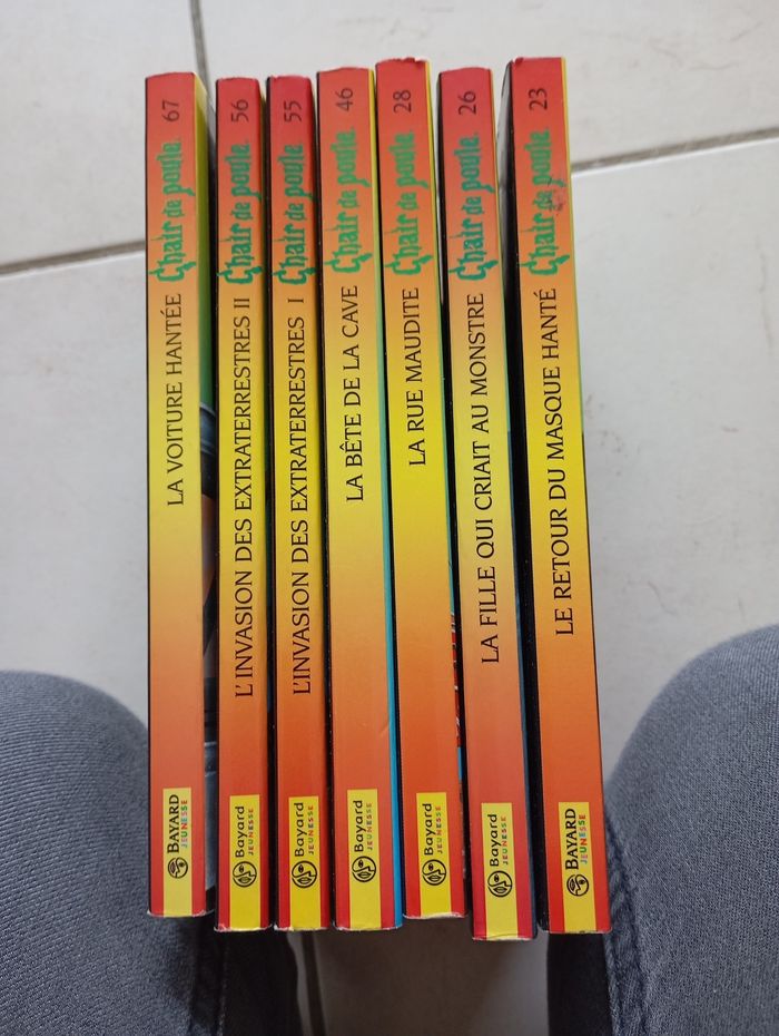 Lot de 7 livres chair de poule de R.L.Stine En très bon état à partir de 10 ans Numéro 23 le retour du masque hanté Numéro 26 la fille qui criait au monstre Numéro 28 la rue maudite Numéro 46 la bête de la cave Numéro 55 l'invasion des extraterrestres 1 Numéro 56 l'invasion des extraterrestres 2 Numéro 67 la voiture hantée