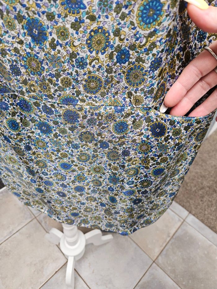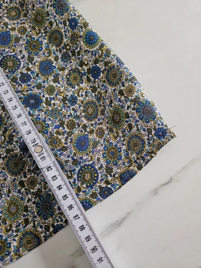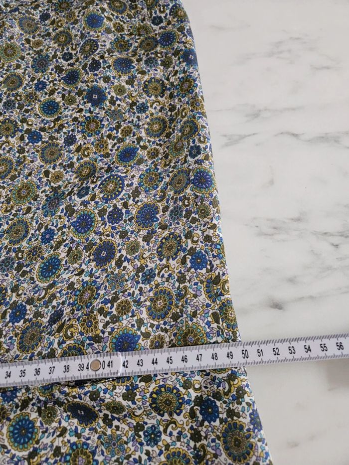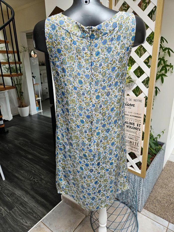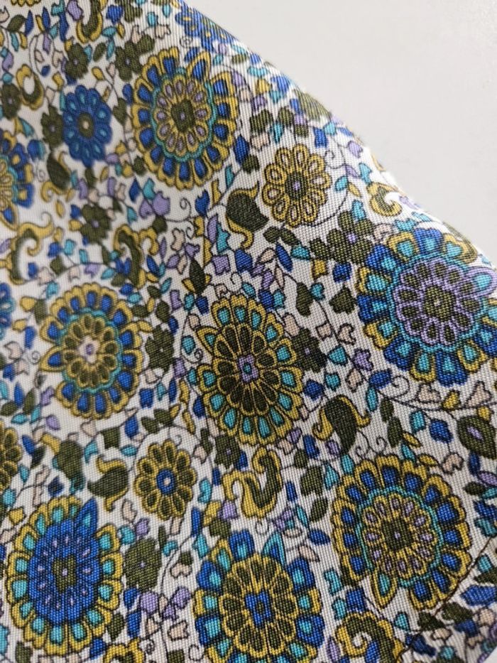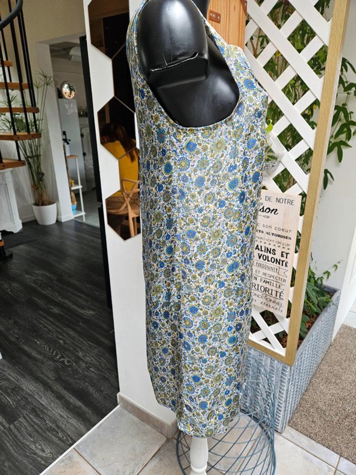 Robe à motifs bleus verts toute légère matière légèrement satinée. Pas d'autre étiquette mais les dimensions se trouvent sur les photos