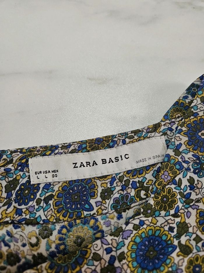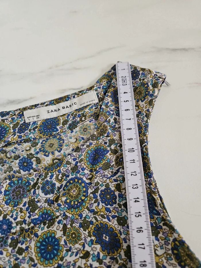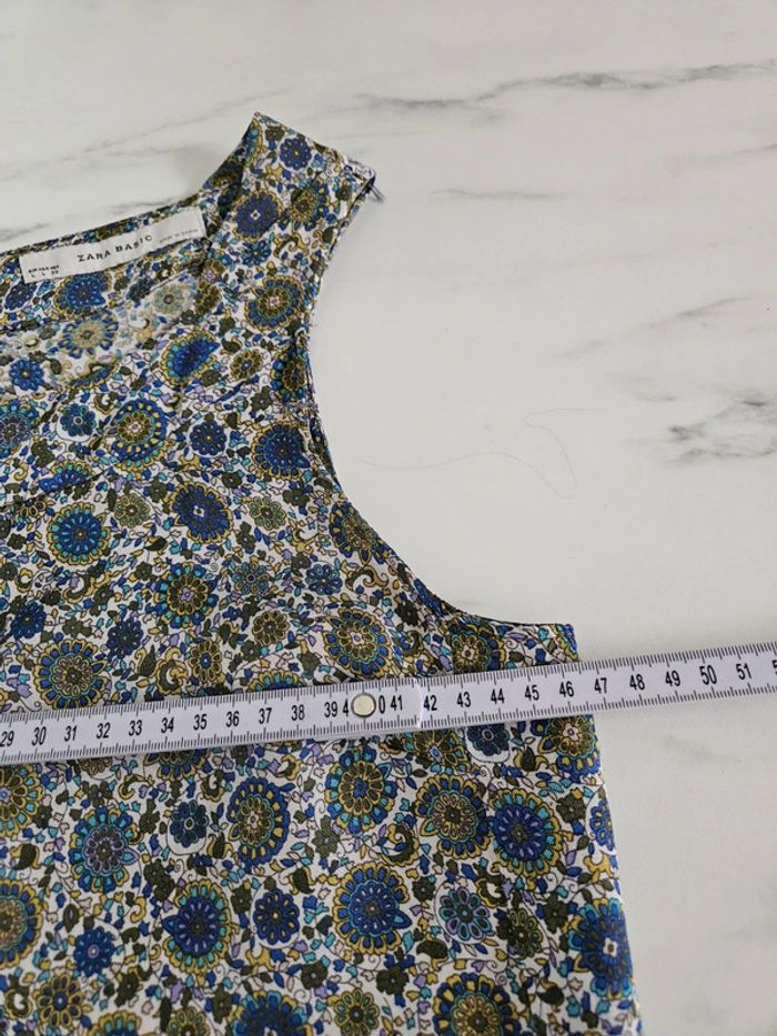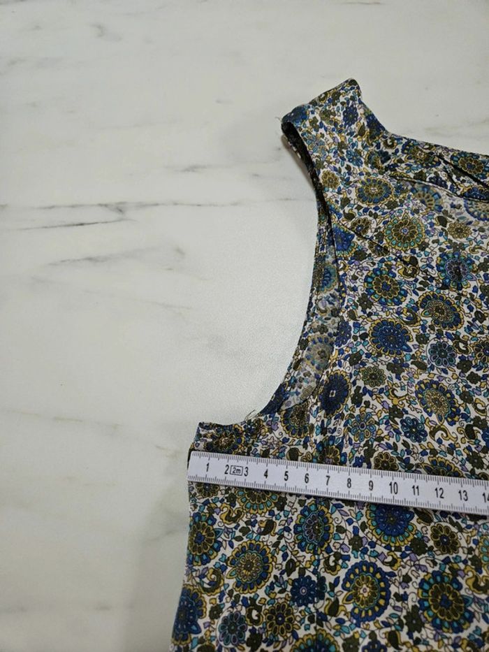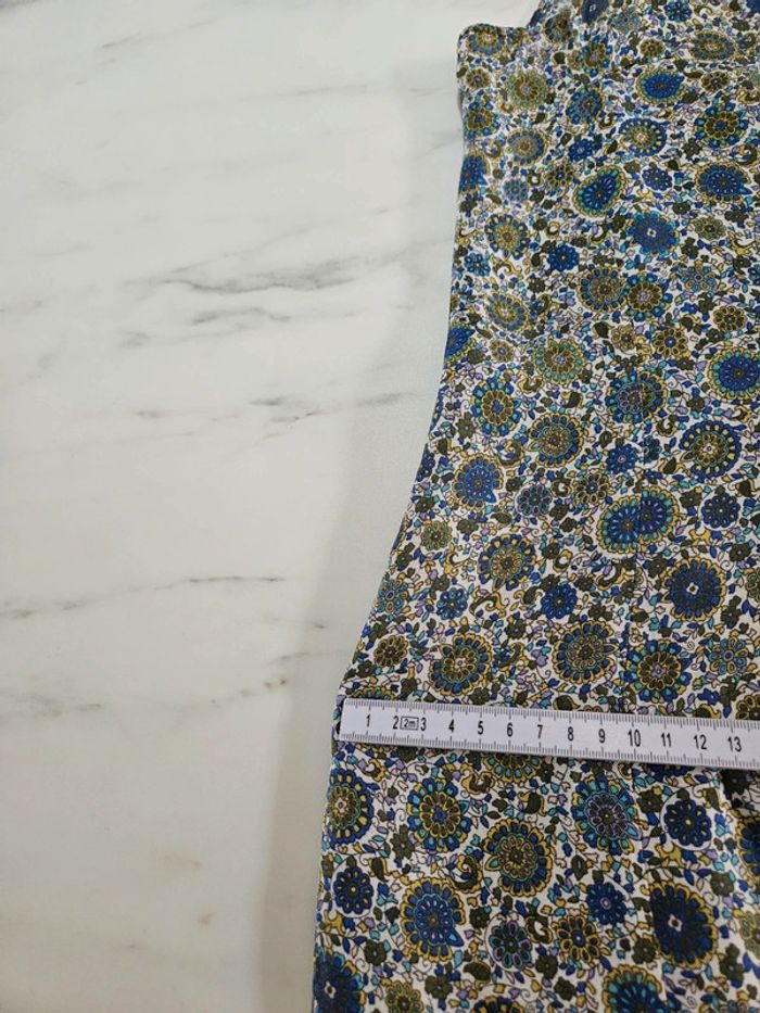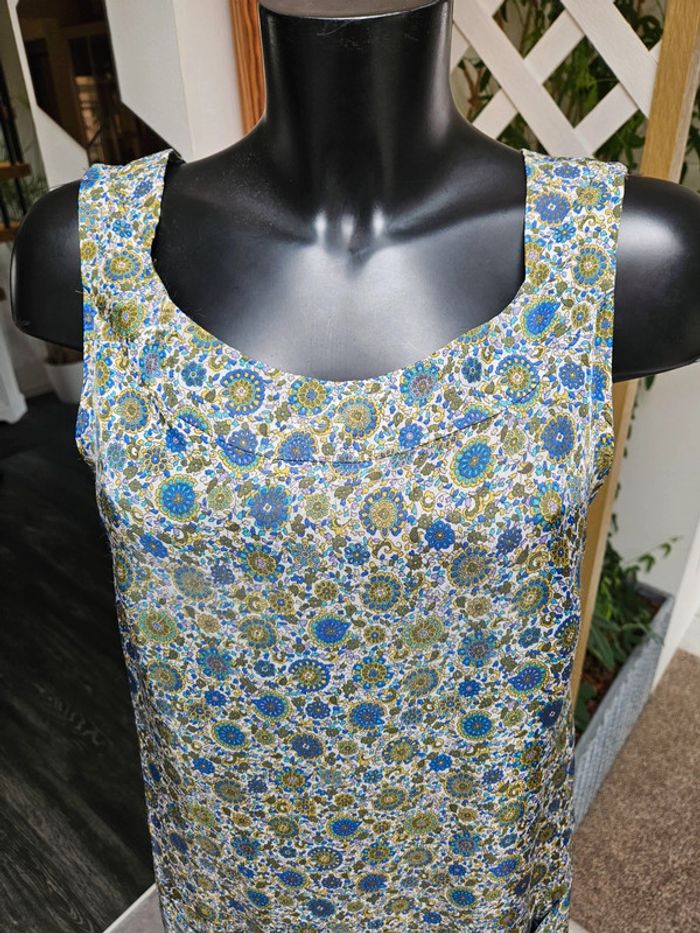 Robe à motifs bleus verts toute légère matière légèrement satinée. Pas d'autre étiquette mais les dimensions se trouvent sur les photos