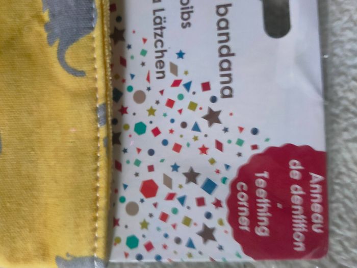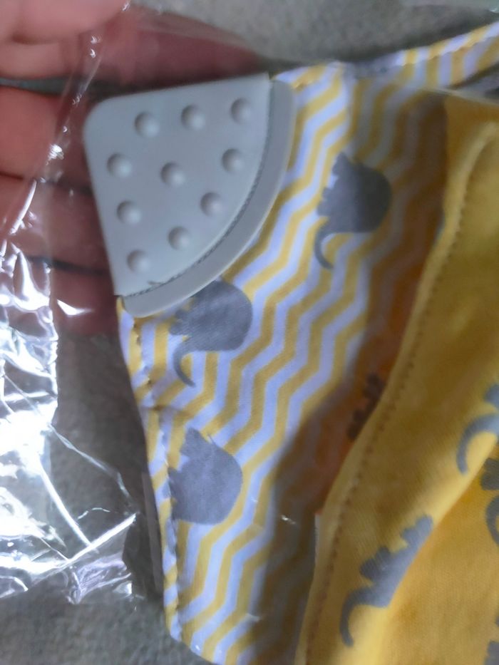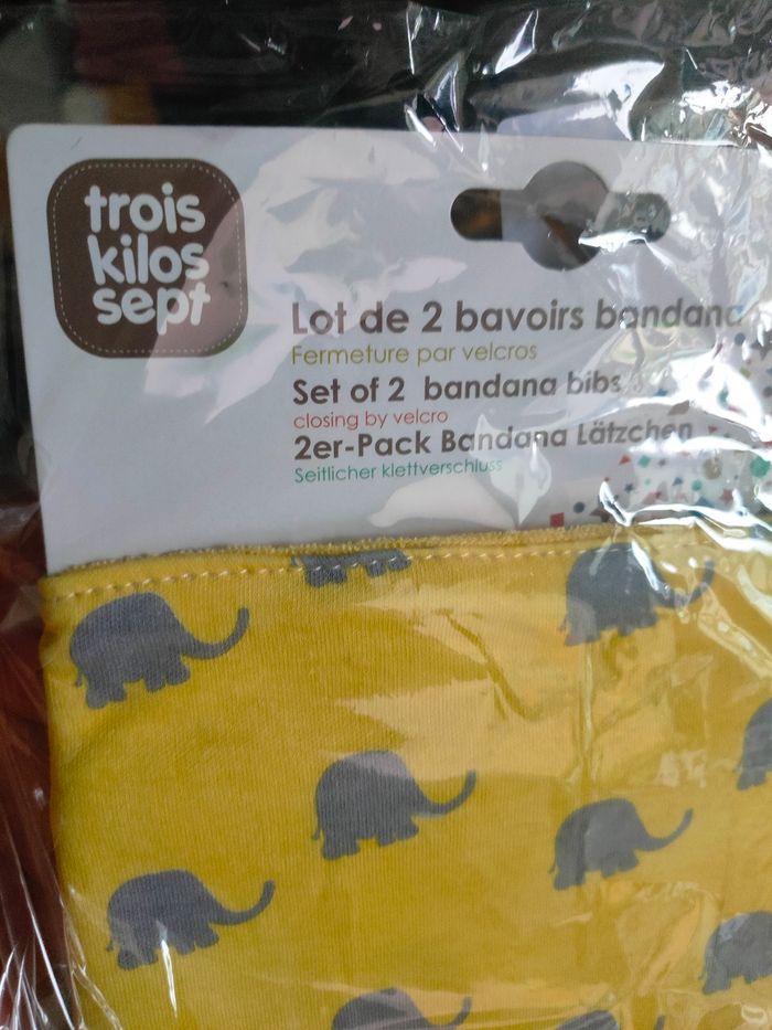 Marque trois kilos sept Coloris jaune gris et blanc avec des éléphants Un comporte un anneau de dentition pour aider bébé quand il fait ses dents Attaches par velcros 100% coton Neufs dans l'emballage idéal en cadeau