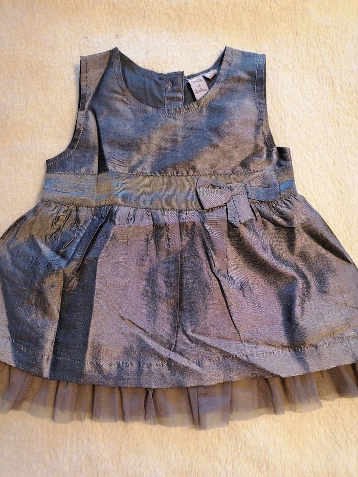 Robe légère grise argentée qui se ferme avec 3 boutons dans le dos. Tulle en bas de la robe Boîte à malice