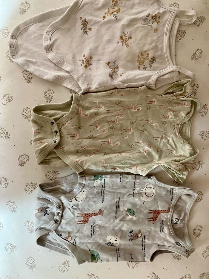 Lot 22 vêtements bébé fille 6mois Marque principalement c&a et orchestra 8 bodys 1 combi courte 4 short 3 tshirt 2 tshirt à manche longue 3 leggings 1 robe 2 vestes Tache en photo