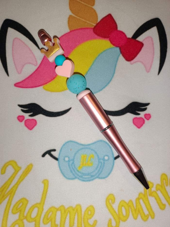Stylo Couronne dorée 100% personnalisable en silicone alimentaire et/ou bois naturel. Encre noir avec recharge bleu. Plus de recharges disponibles dans les Accessoires. Énormément de choix pour les composants, envoyez-moi un message afin de créer main dans la main votre accessoire idéal.