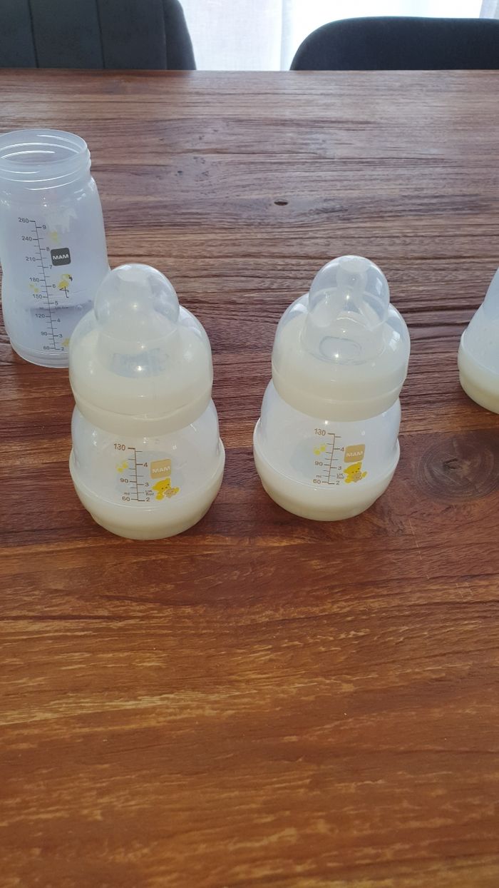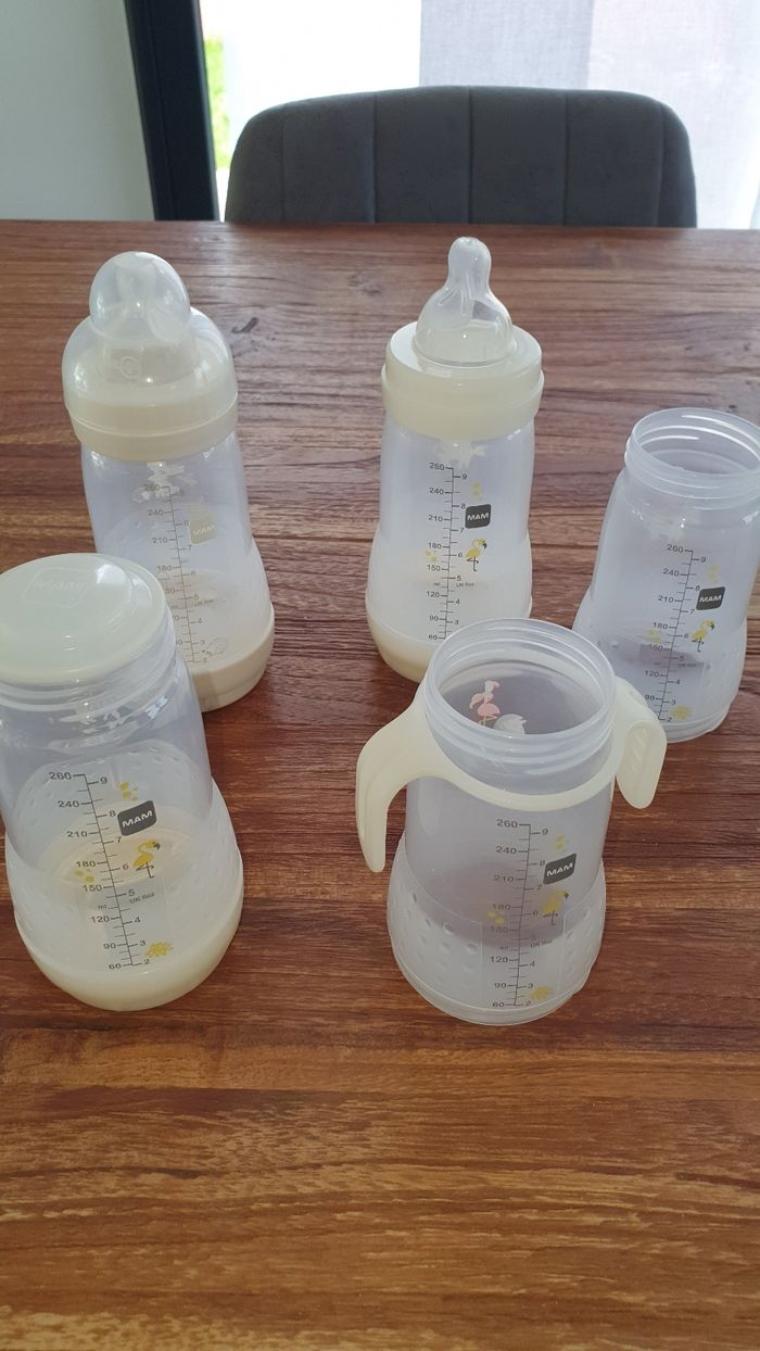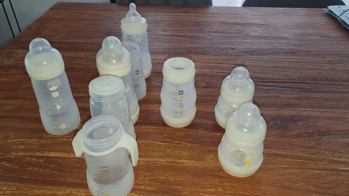 2 biberons 130 ml 2 biberons 160 ml 5 bib de 260 ml 1 bib 320 ml Les biberons sont en bon état. 6 socles tétine 5 fonds de biberons 4 capuchons de tétines 1 capuchon beige 1 poignée de biberon 2 tétines débit 1 non utilisées juste lavées Mon fils prefere une autre marque de bib.