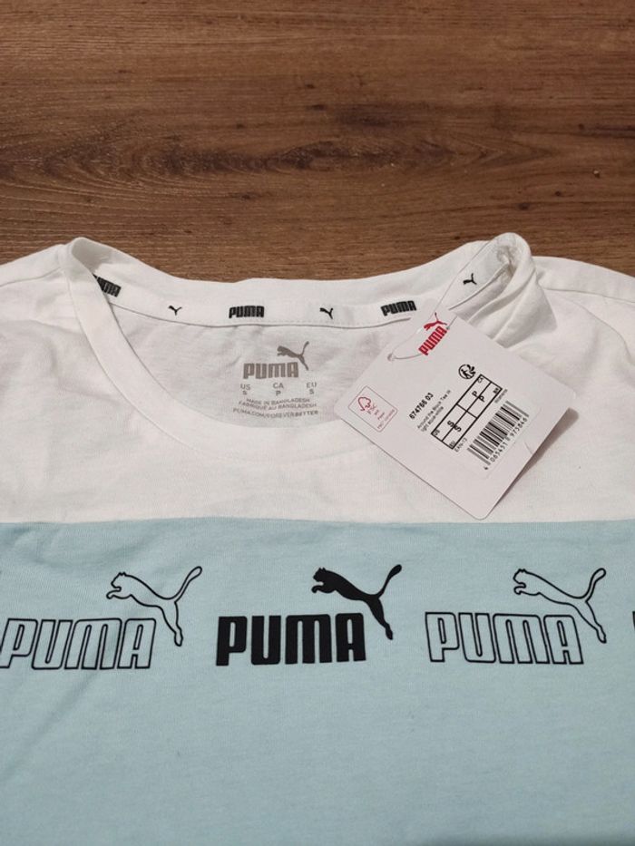T-shirt Puma blanc et bleu clair, taille S, neuf avec étiquettes. #puma #pumafemme #tshirtfemme #alinel5403femme_sport