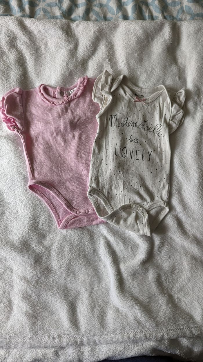 Lot de 2 bodys MC taille 3 mois. Pouvant être portés sans t-shirt grâce à ses jolies manches. Idéal pour l'été.