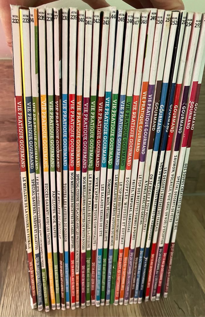 Je vends ce lot complet de 26 magazines de cuisine de Cyril Lignac. - des numéros 232 à 257 : année 2012 Ils sont en bon état : pas déchirés et propres. Possibilité d’achat à l’unité : 2,50 € pièce