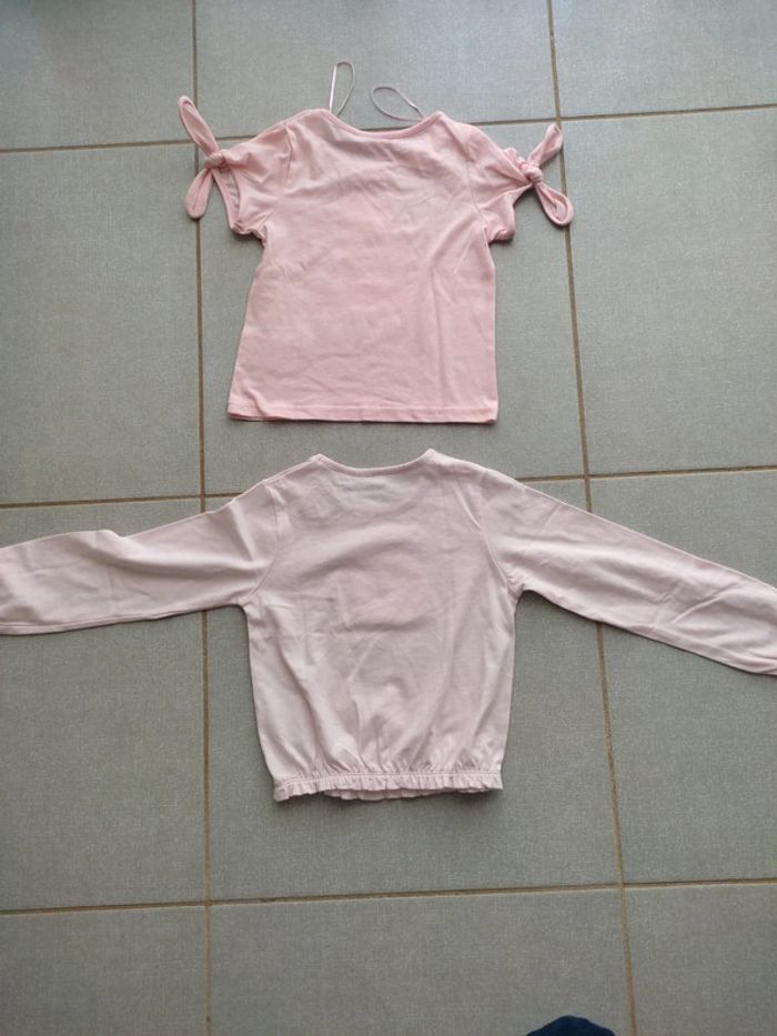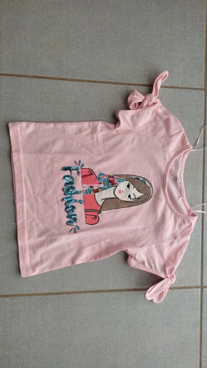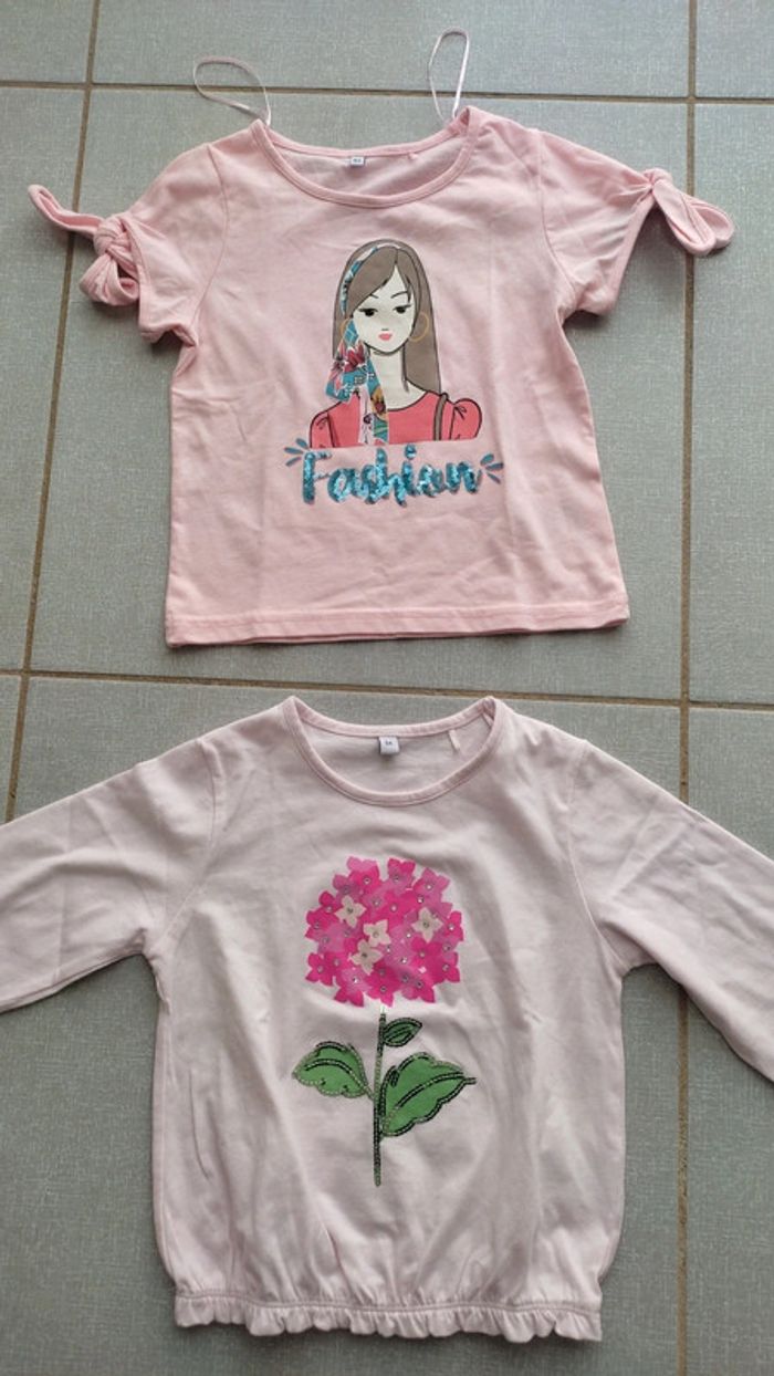 Lot de 2 t-shirts composé de : • 1 t-shirt manches courtes avec des nœuds aux manches. Motif fille avec inscription Fashion en sequins. 58% coton 42% polyester • 1 t-shirt manches longues resserré à la taille et aux poignets. Motif fleur avec sequins et petits diamants. 60% coton 40% polyester Neufs jamais portés, juste lavés Foyer non fumeur