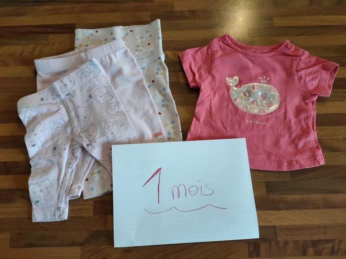 Lot 1 mois avec: 1 t-shirt obaibi 1 legging hetm à fleur, taille 0 mais grand 1 legging Kiabi(chats) et 1 sucre d'orge