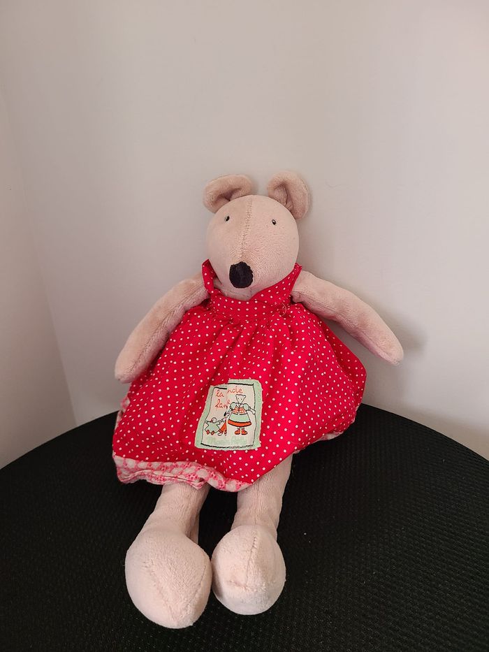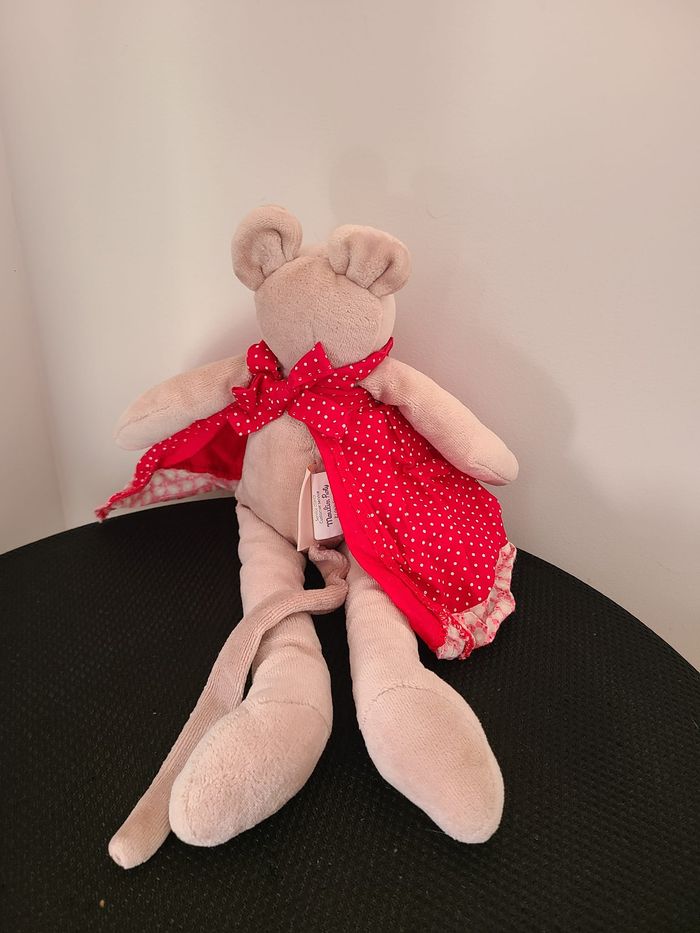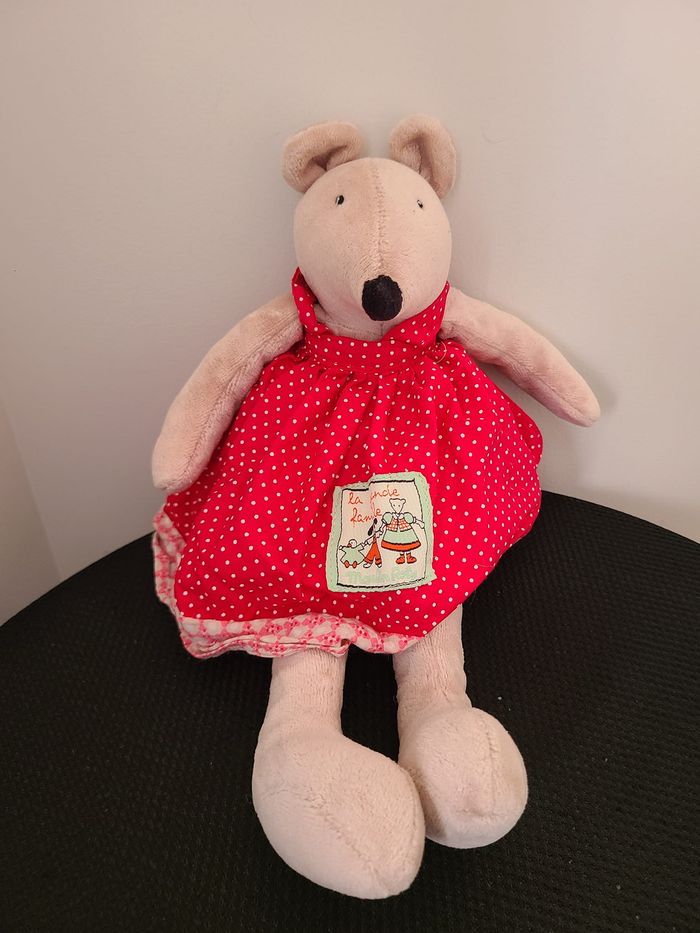 Moulin Roty Taille : environ 30 cm Cette peluche en velours raz est un doudou Nini la souris vêtue d'une robe rouge à pois blanc avec une étiquette "La grande famille".