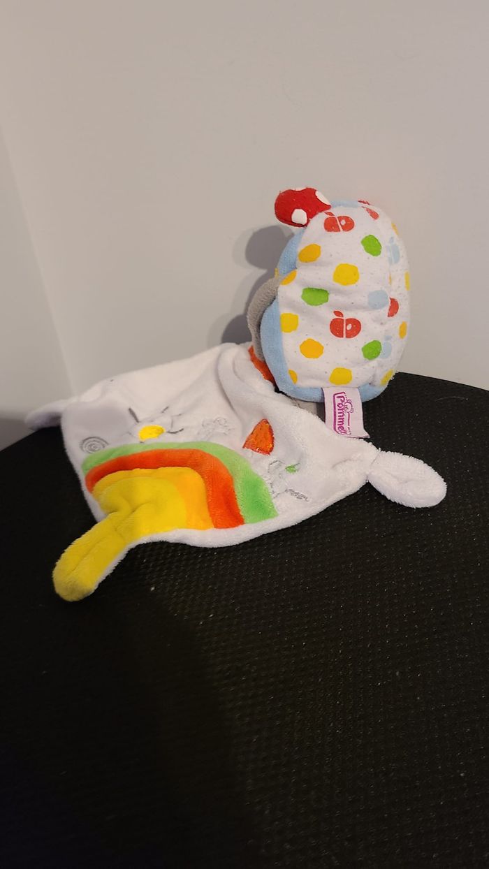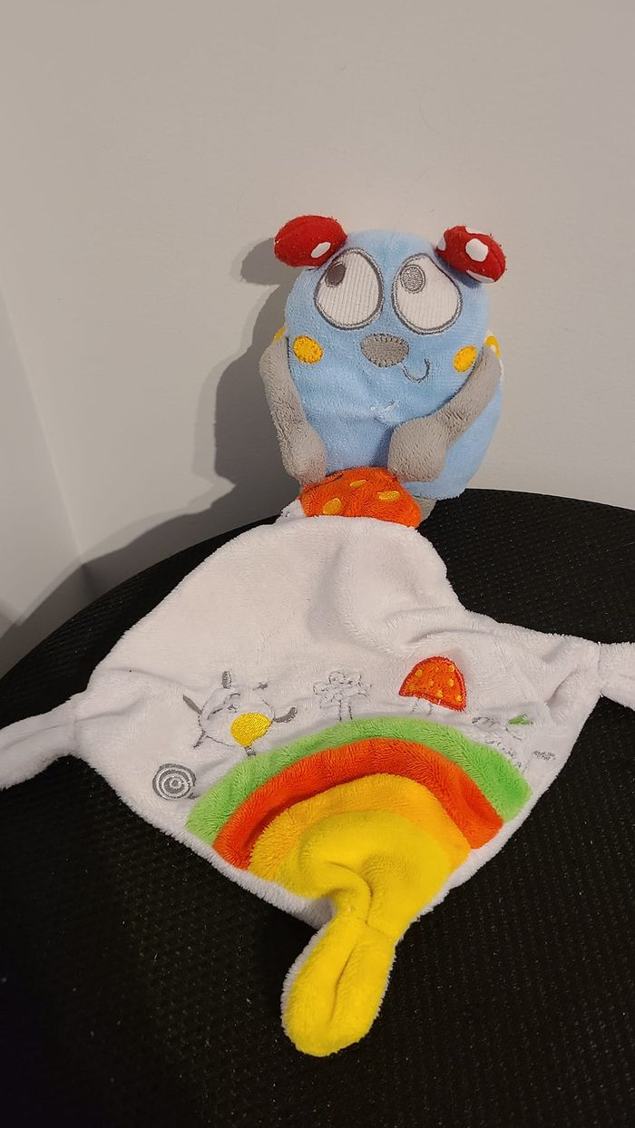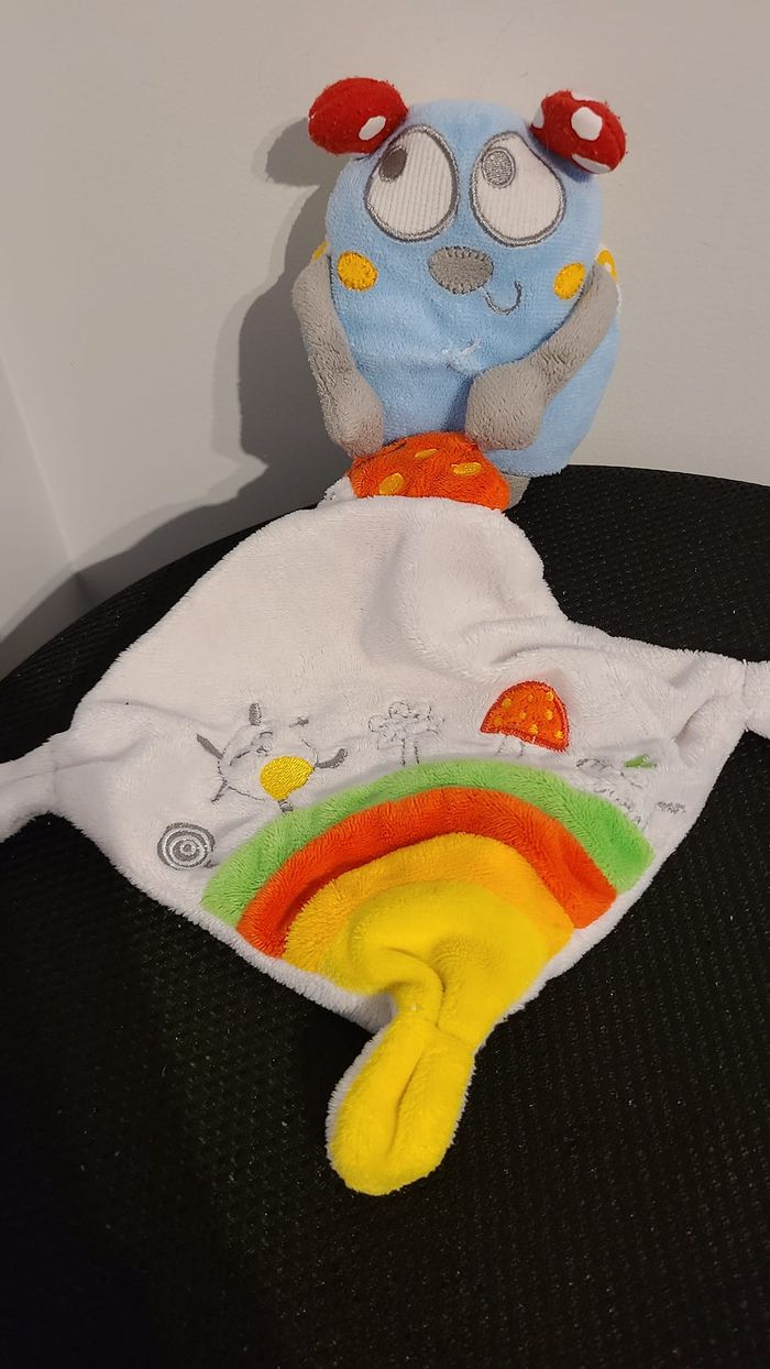 Pommette Taille : environ 30 cm Coccinelle? chouette? Bleue, verso blanc et pois multicolores, 14cm. Tient un mouchoir blanc avec un arc-en-ciel jaune vert orange et rouge avec une coccinelle et des broderies, 23x23cm. 138