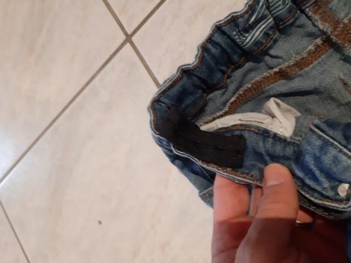 Pantacourt en jeans, bas du pantacourt bien fini avec un zip. tour de taille réglable par élastique. Couleur bleu jeans. En parfait état