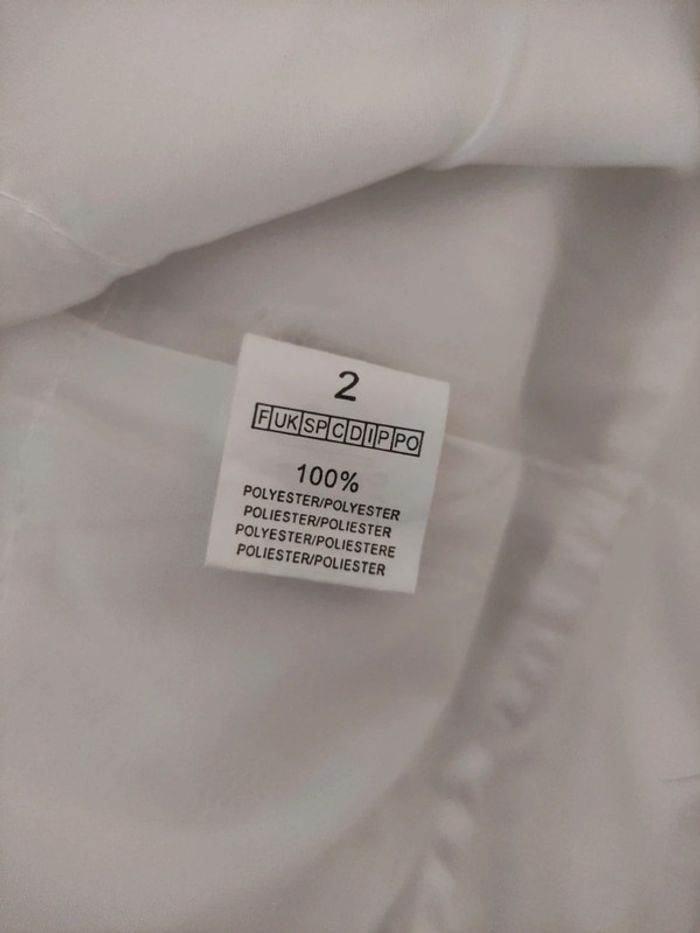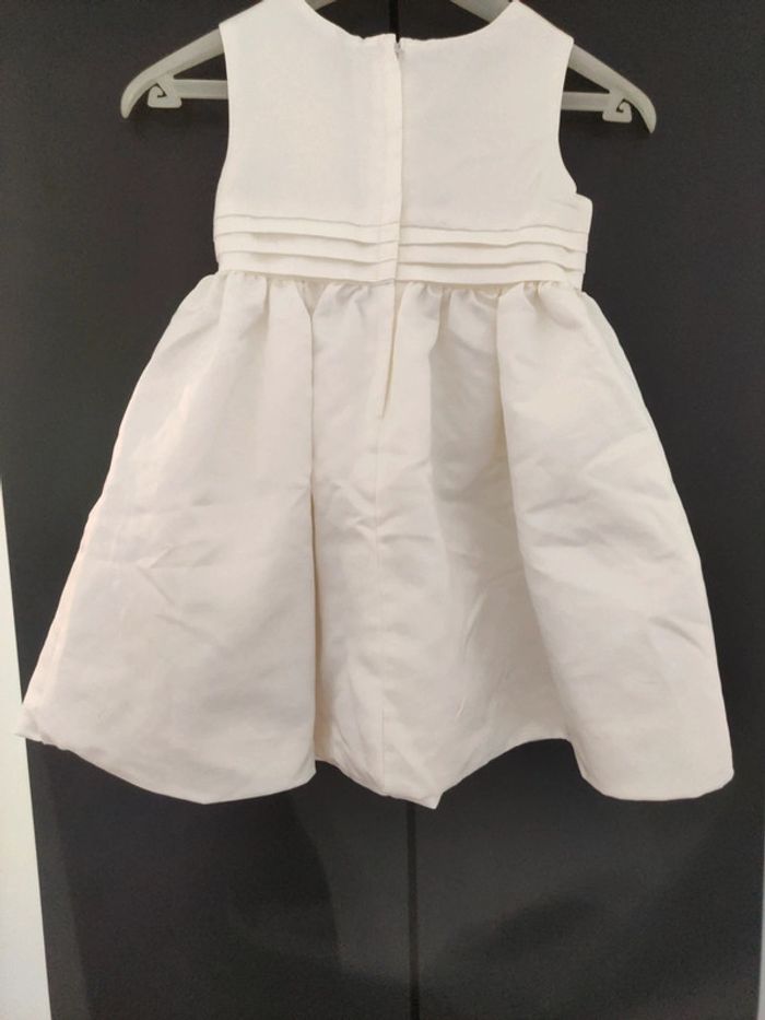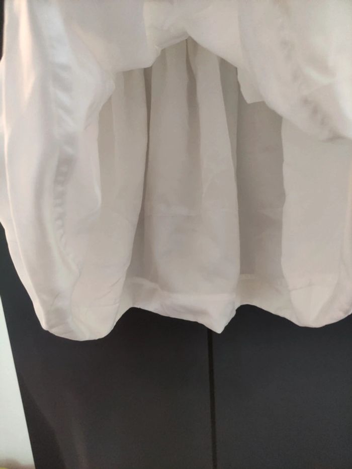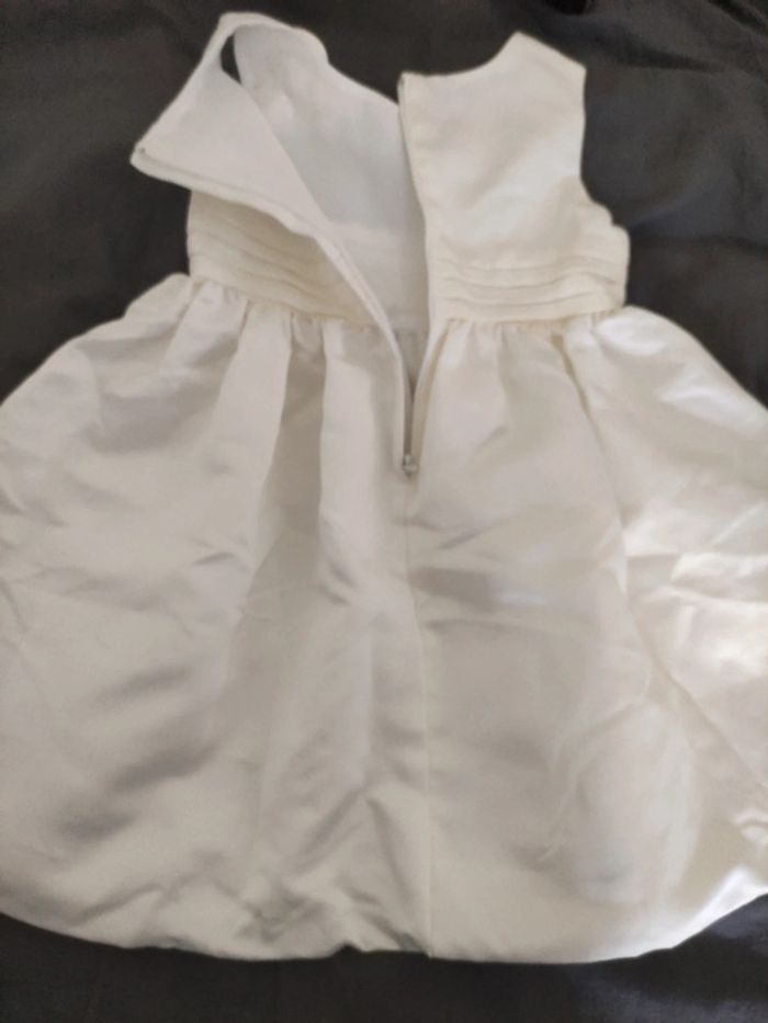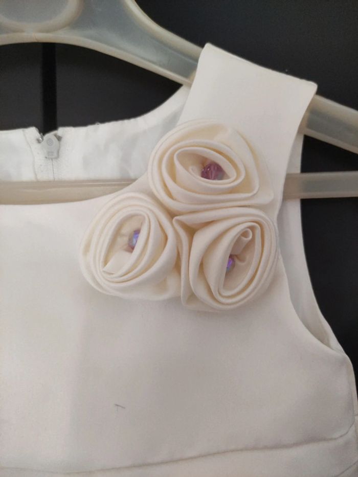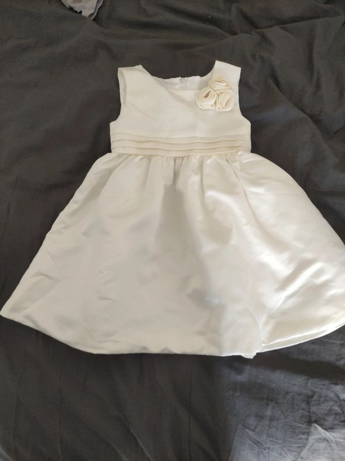 Robe de cérémonie couleur ivoire imitation satin. Portée quelques heures seulement. Petites perles mauve façon cristal dans les roses.