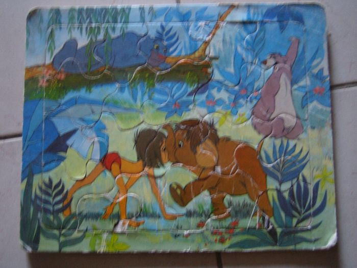 puzzle de 22 pièces sur la livre de la jungle avec mowgli le petit homme, balou l'ours, bagheera la panthère et hathi l'éléphant. Le contour des pièces sont dessinés en dessous sur le socle pour aider l'enfant à les placer (22 pièces). Un peu abîmé