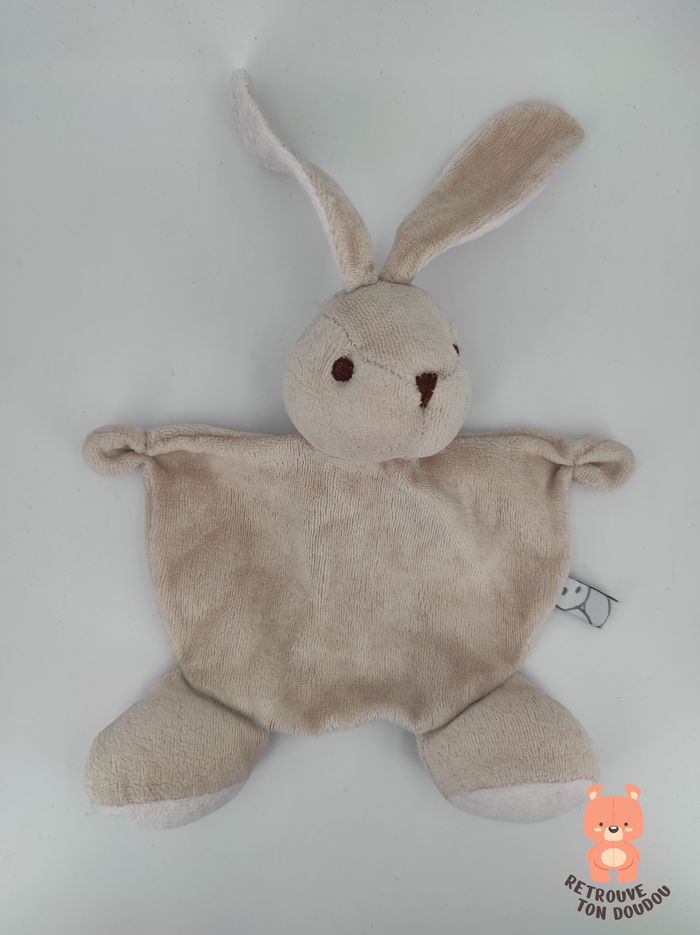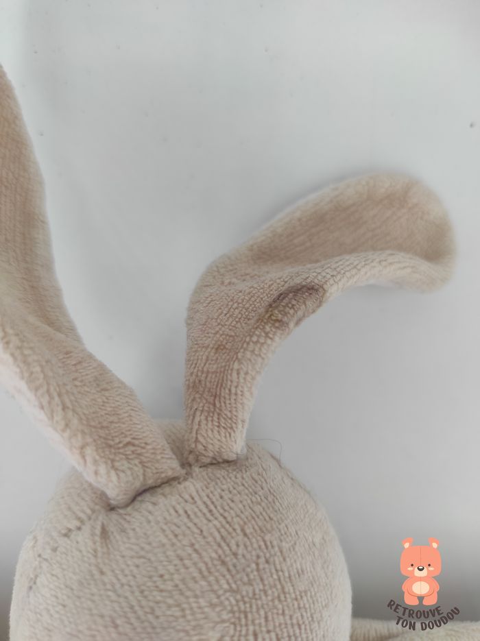 🐇 Doudou Plat Demi-Cercle Lapin Beige et blanc avec yeux nez et queue marron, marque inconnue 📏 Dimension : 20 cm environ ✨ Occasion, correct, utilisé, tâché à l'oreille et un mini trou à la base du cou 🧼 Lavé avec lessive hypoallergénique 👀 Vous achetez le doudou que vous voyez sur les photos.