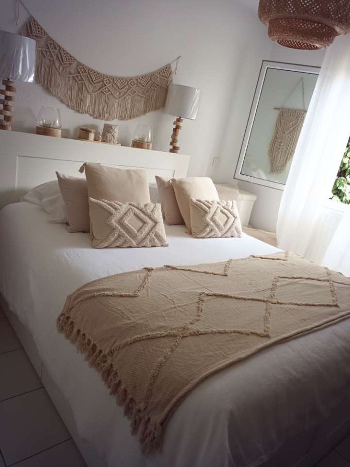 Joli plaid à franges boho chic beige neuf Sur la photo, il est plié en deux et le lit est un 160 x 200 cm Dimensions environ 162 cm x 132 cm Deux identiques de disponibles à 35 € l'unité Mots clés Muy Mucho Casa Alinea Ikea Maisons du monde Boho bohème chic beige crème blanc clair chic bois couvre lit couverture plaid jeté de lit