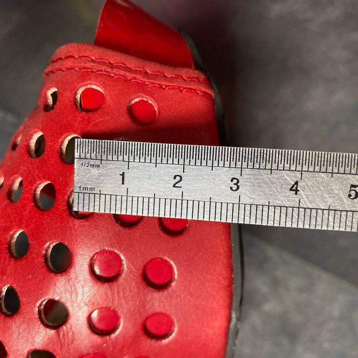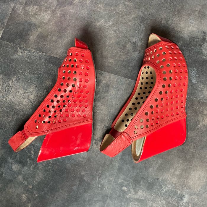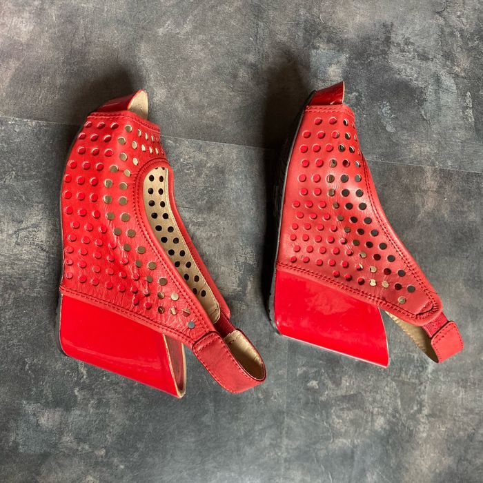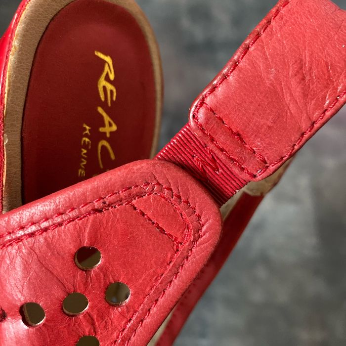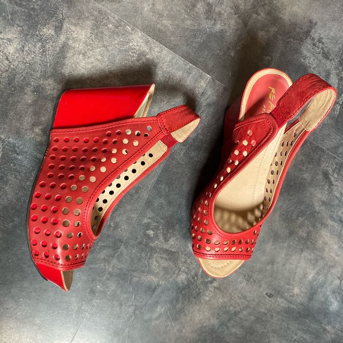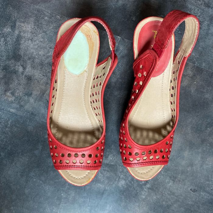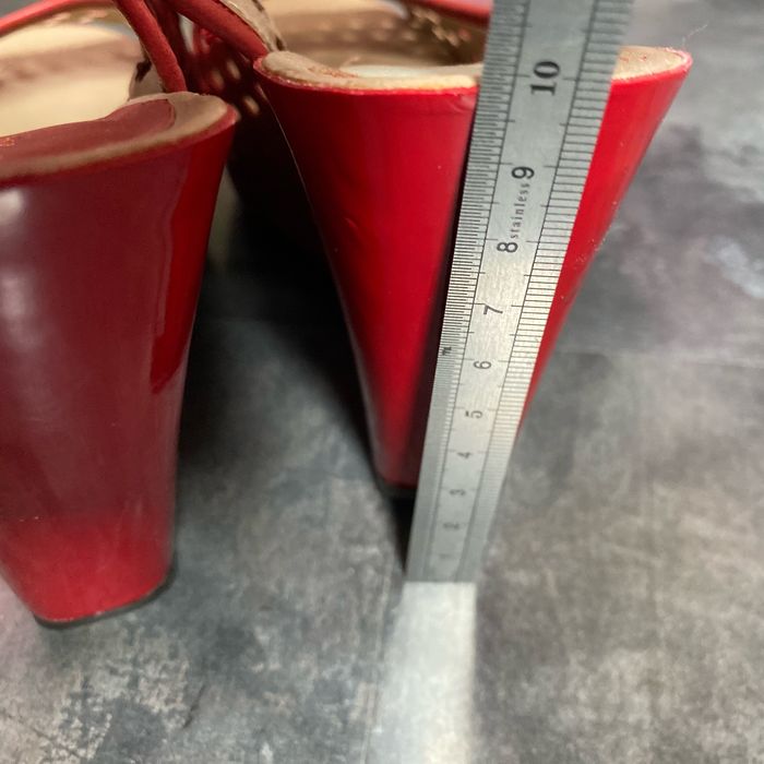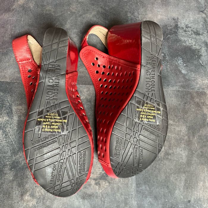 Nu pieds compensés rouge Pointure 6 1/2 M 38 kennethcole réaction Environ 7 cm à la marche Manque une pastille sur une chaussure La semelle intérieur mesure 24 cm
