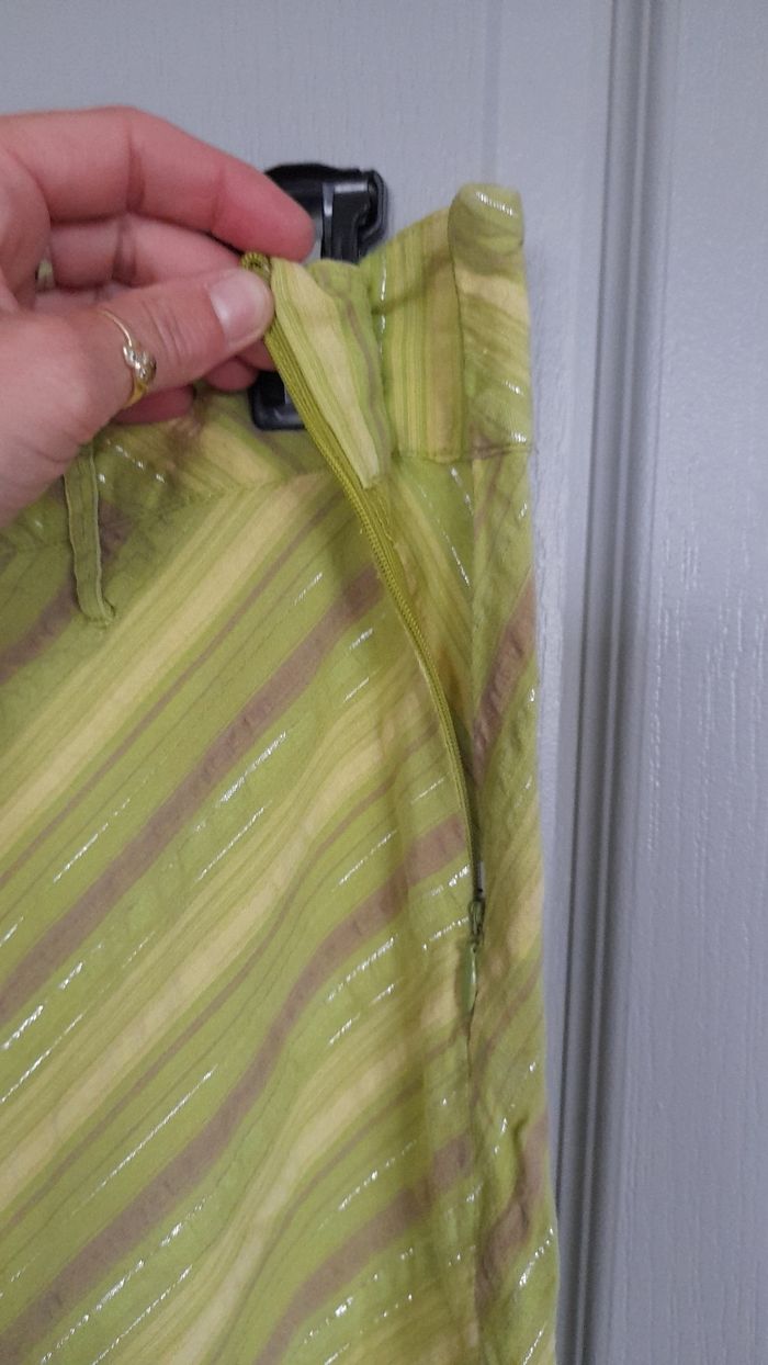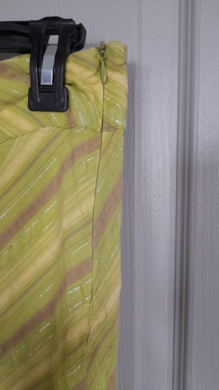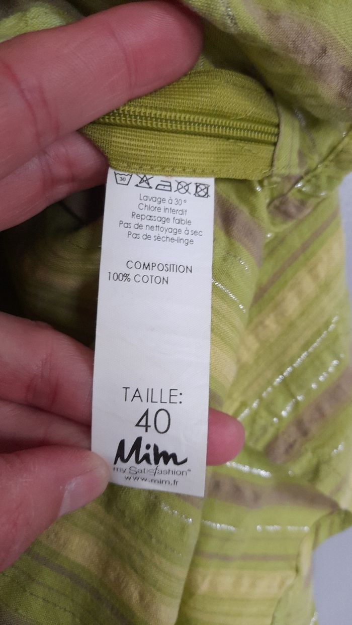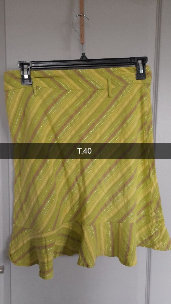 Jupe verte, avec passants pour insérer une ceinture si besoin. Fermeture eclair sur le côté. Couleur verte à rayures, de marque mim taille 40. En très bon état, 100% coton