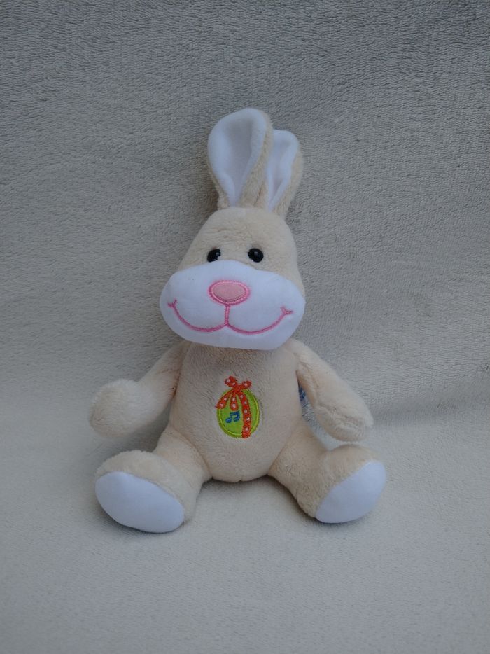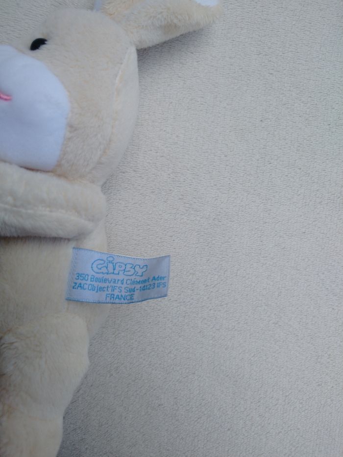 Peluche lapin Marque Gipsy • Coloris jaune pâle, blanc • Ventre musical • Lapin mou avec billes au dos • Doux Fonctionne En très bon état #evelyne_peluches