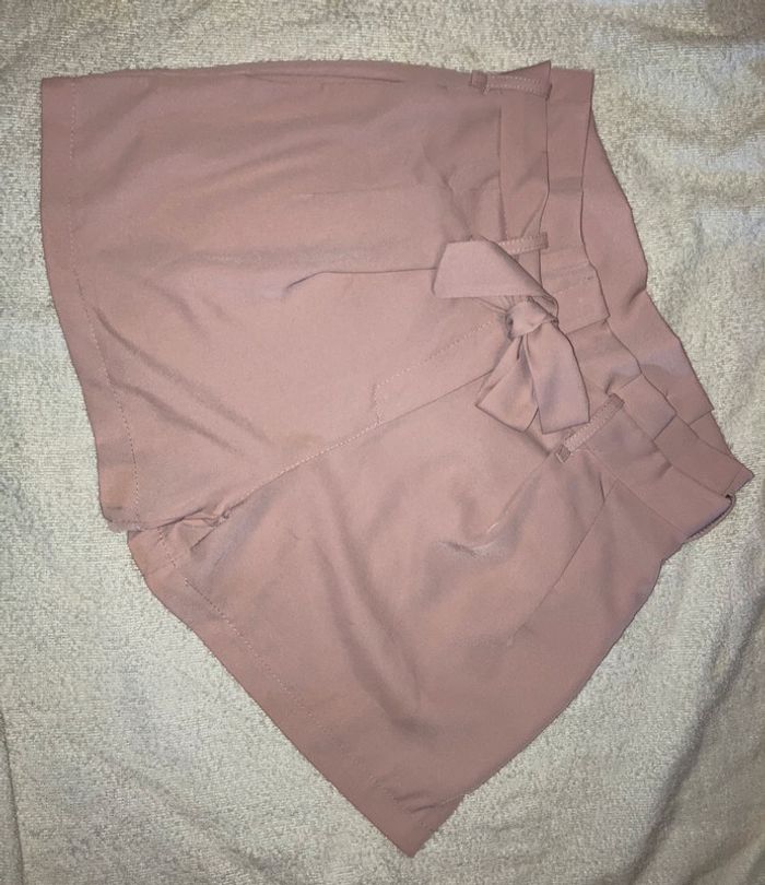 short fluide taille haut, fermeture éclair et ceinture qui se noue devant.