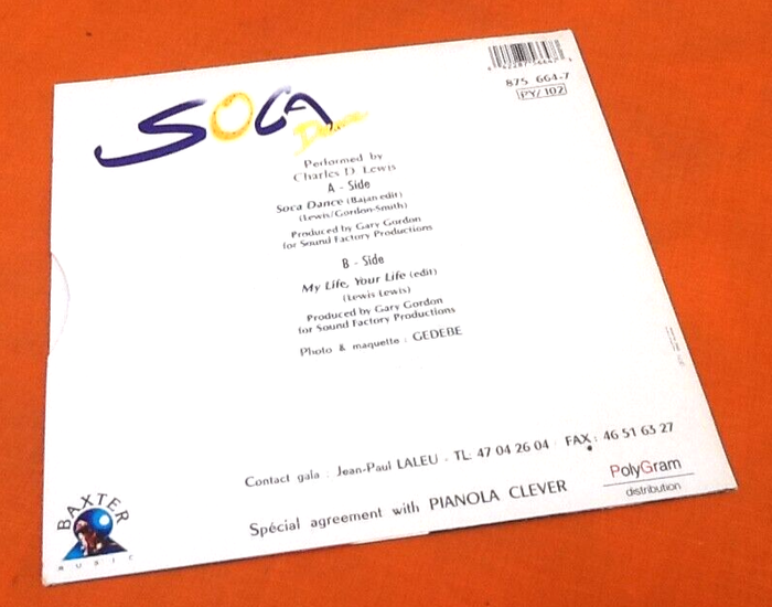 Vinyle 45 tours Charles D. Lewis Soca Dance (1990) Baxter Music 8756647 A Soca Dance (Bajan Edit) Written-By – Lewis*, Gordon-Smith* 3:39 B My Life, Your Life (Edit) Written-By – Lewis* 4:23