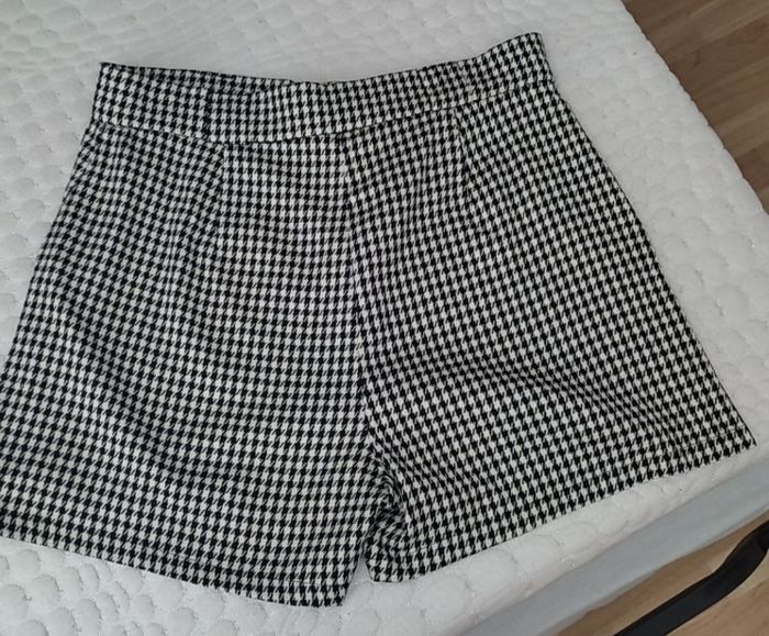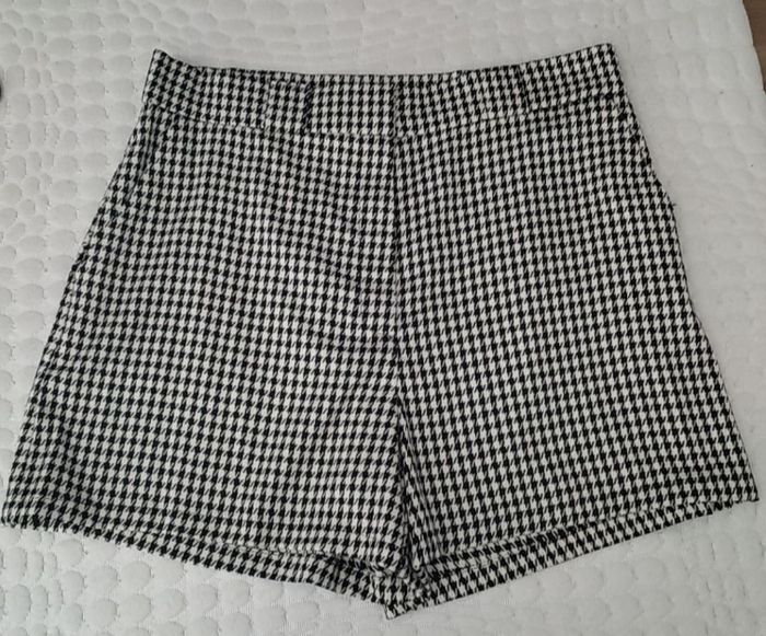 Short pied de poule de la marque Kiabi fermeture éclair et encoche en métal (voir photo) possibilité de mettre une ceinture encoche prévu a cette effet et 1 poche de chaques côtés. Taille 46 jamais mit